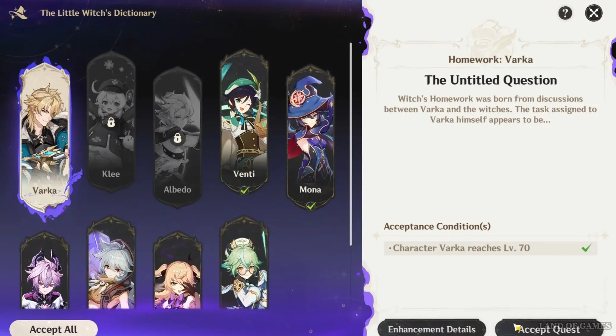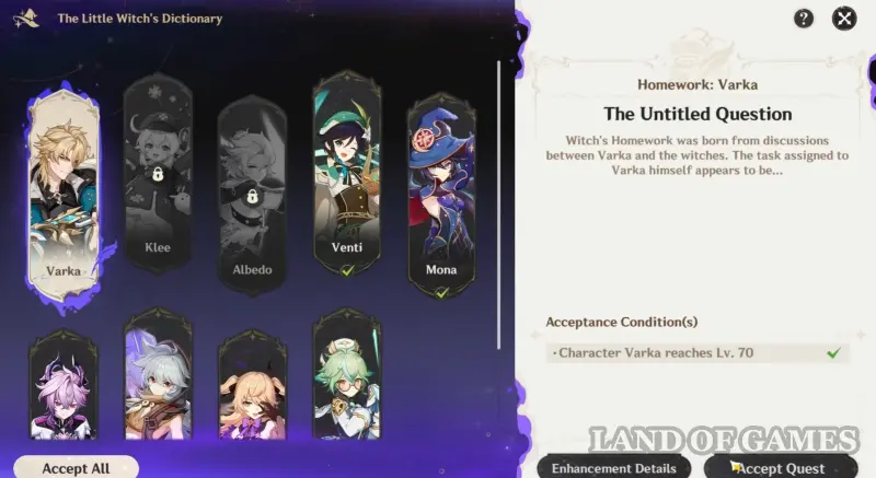Здесь все довольно просто – вам необходимо открыть книгу в своем инвентаре, а затем выбрать одного из 8 персонажей (Венти, Кли, Альбедо, Мона, Дурин, Рэйзор, Фишль или Сахароза) и пройти уникальное для него задание, чтобы он стал ведьмовским героем (вы также можете принять сразу все миссии, если нажмете на одноименную кнопку в нижнем левом углу Словаря). Однако для этого вы должны соответствовать двум требованиям: