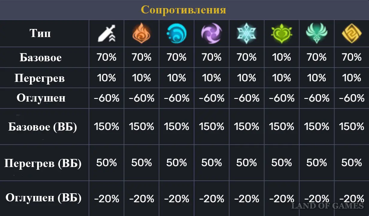 В обычном состоянии этот противник обладает повышенной устойчивостью ко всем элементам в размере 70% (150% в Витой Бездне). Однако при нанесении ему Пиро урона он начнет перегреваться, и когда соответствующая шкала достигнет половины, его сопротивление к стихиям упадет до 10% (50%), но при этом он получит Крио щит, из-за чего станет неуязвимым к Крио урону. Если снять барьер до того как спадет шкала ярости (примерно 18 секунд), то резисты и вовсе снизятся до -60% (-20%), а сам босс лишится 30% здоровья.