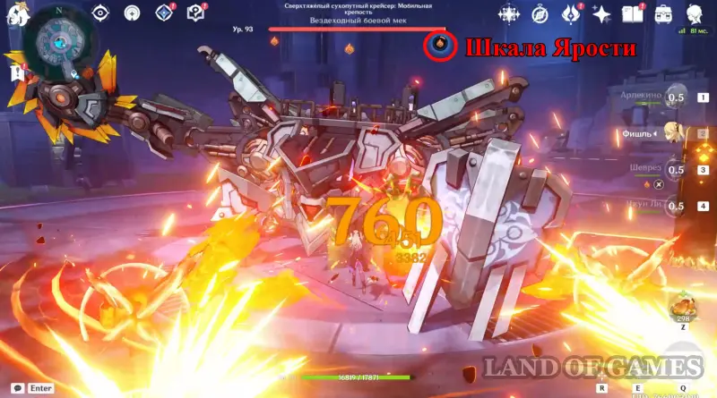Когда вы доведете шкалу Ярости босса до 100%, он тут же создаст себе Крио щит, который вам необходимо будет уничтожить менее чем за 18 секунд, используя все свои самые мощные огненные атаки. Если вы не успеете сделать это, то противник выполнит крайне опасные удары по площади. В случае успеха, Мобильная крепость будет парализована, и вы сможете бить ее, не боясь получить контратаки.