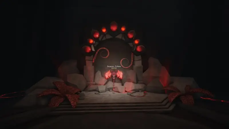 После получения ключа дверь открывается, и внутри вы увидите Демоническую кирку на алтаре. Она стоит очень дорого, но это финальный инструмент на текущий момент игры и стоит потраченных ресурсов – 500 000 $.