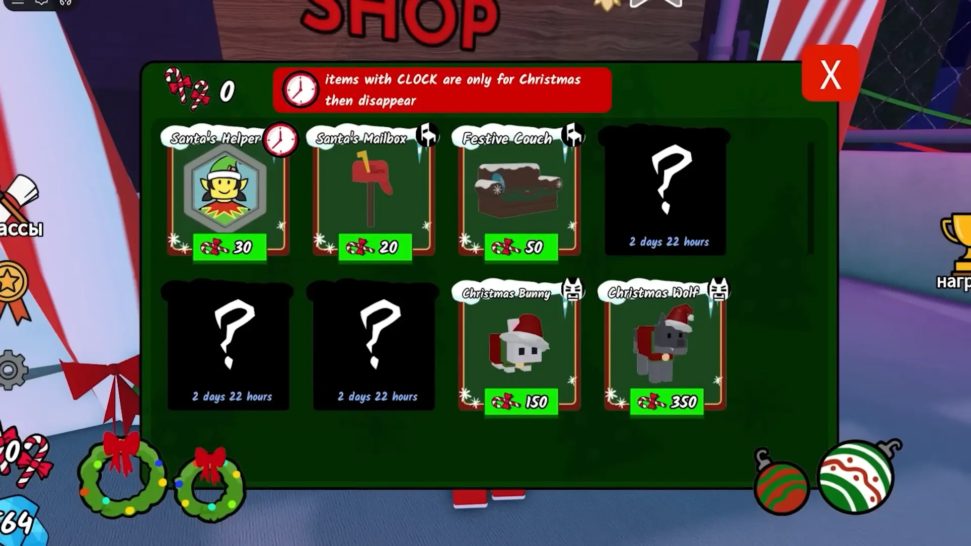 Ассортимент магазина состоит из восьми позиций. На старте доступны не все – несколько предметов открываются спустя несколько дней после начала недели обновления. В качестве валюты используются карамельные трости, которые добываются во время выполнения праздничных активностей.