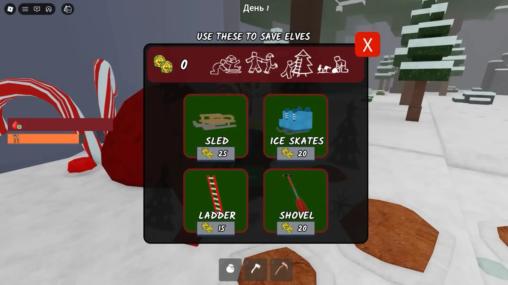 Чтобы спасать эльфов, вам понадобятся специальные зимние предметы. Их можно купить в мешке Санты, который находится рядом с костром в лагере. Все предметы приобретаются за мшистые монеты.