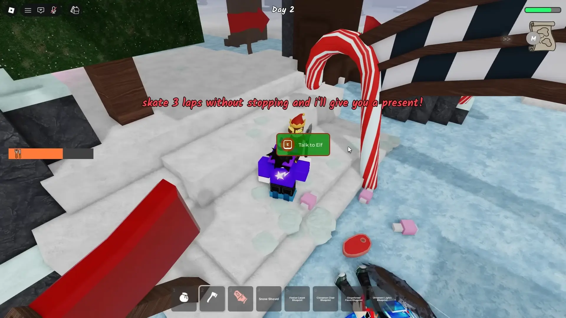 Это мини-испытание. Чтобы помочь эльфийке в красном колпаке, нужно надеть коньки и проехать три круга по трассе, не сходя со льда и перепрыгивая препятствия.