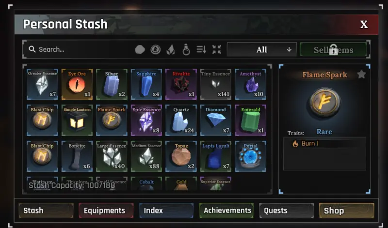 Flame Spark (Пламенная искра) – выпадает со Скелета-смертельного топора, Элитного скелета-смертельного топора, Жнеца и Пылающего слайма. Чем опаснее враг, тем выше шанс. Основная зона – Забытое Королевство и Вулканические глубины.