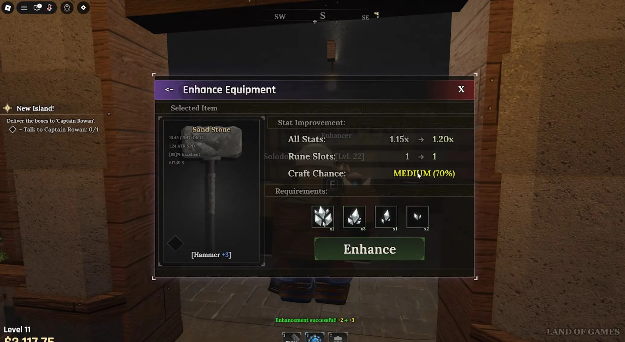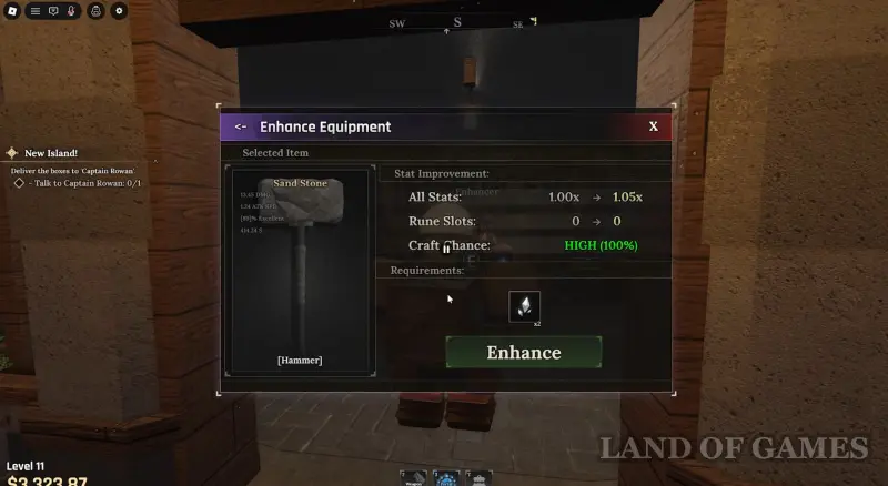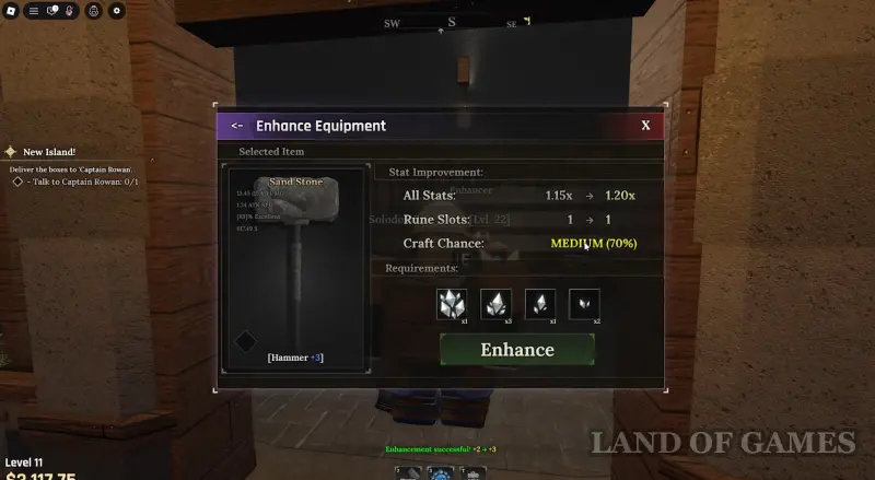Подойдите к мастеру и выберите ответ: «Да, я здесь, чтобы усилить» (Yes, I’m here to enhance), после чего откроется меню выбора снаряжения, где вам нужно нажать на предмет, который вы хотите улучшить. Далее откроется меню усиления экипировки. Вы увидите, насколько увеличатся статы вещи (повысит мультипликатор), шанс крафта и количество ресурсов, необходимых для проведения процедуры.
