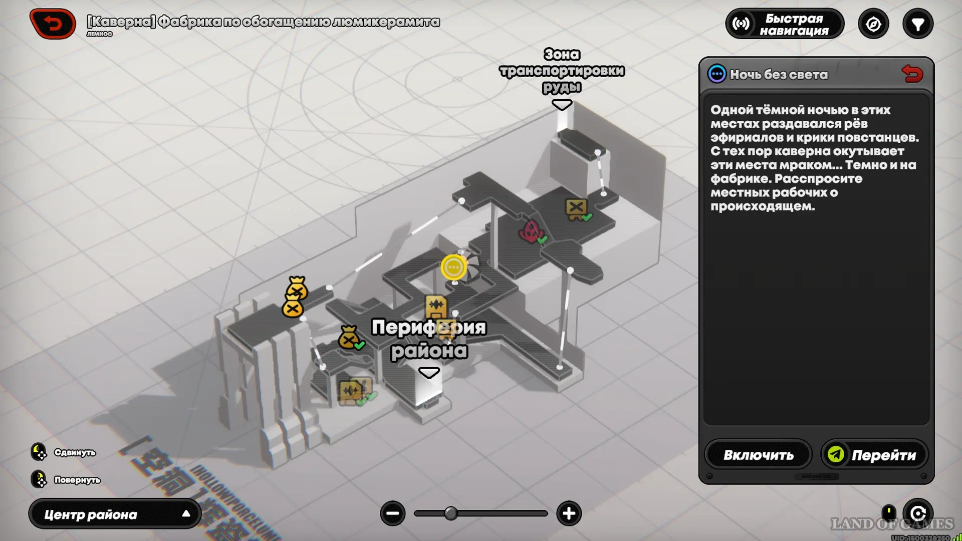 Теперь нужно попасть в Центр района: от лифта, на котором мы ранее спустились на нижний уровень карты, нужно пробежать вправо и попасть в ангар — у этой области есть отдельная карта и телепорт «Цех обогащения». Поднимайтесь от входа вправо или используйте местный телепорт, взяв курс на метку квеста «Ночь без света».