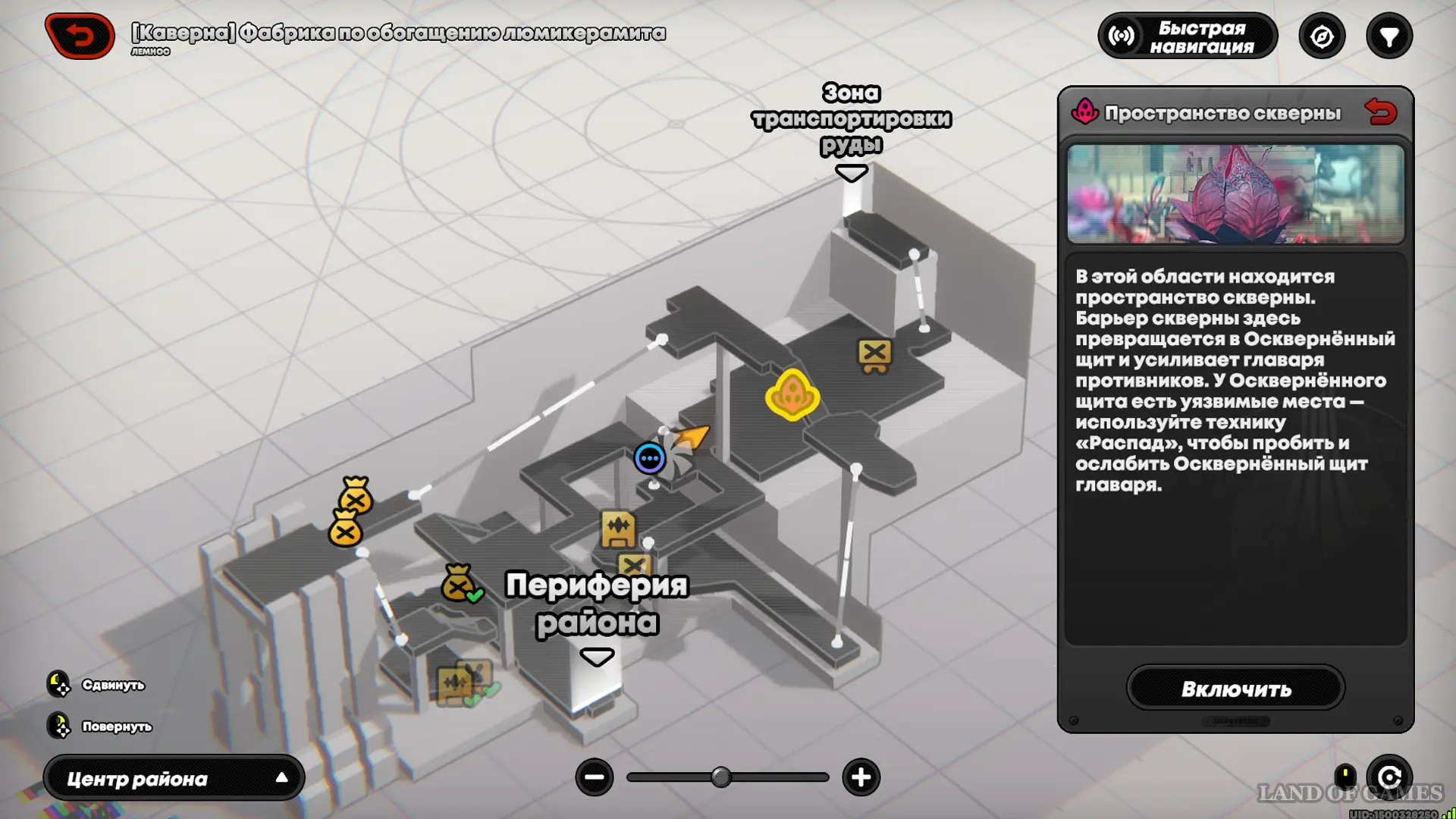 От Цеха обогащения пройдите в зал с пространством скверны. В центре вас ожидает босс, а по периметру расположены три миазмы — уничтожив их заранее, вы значительно упростите предстоящую битву.