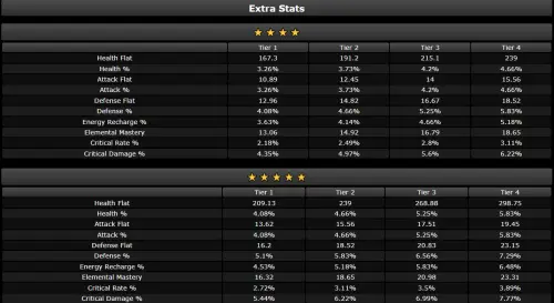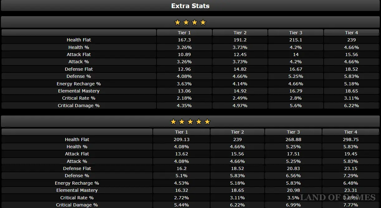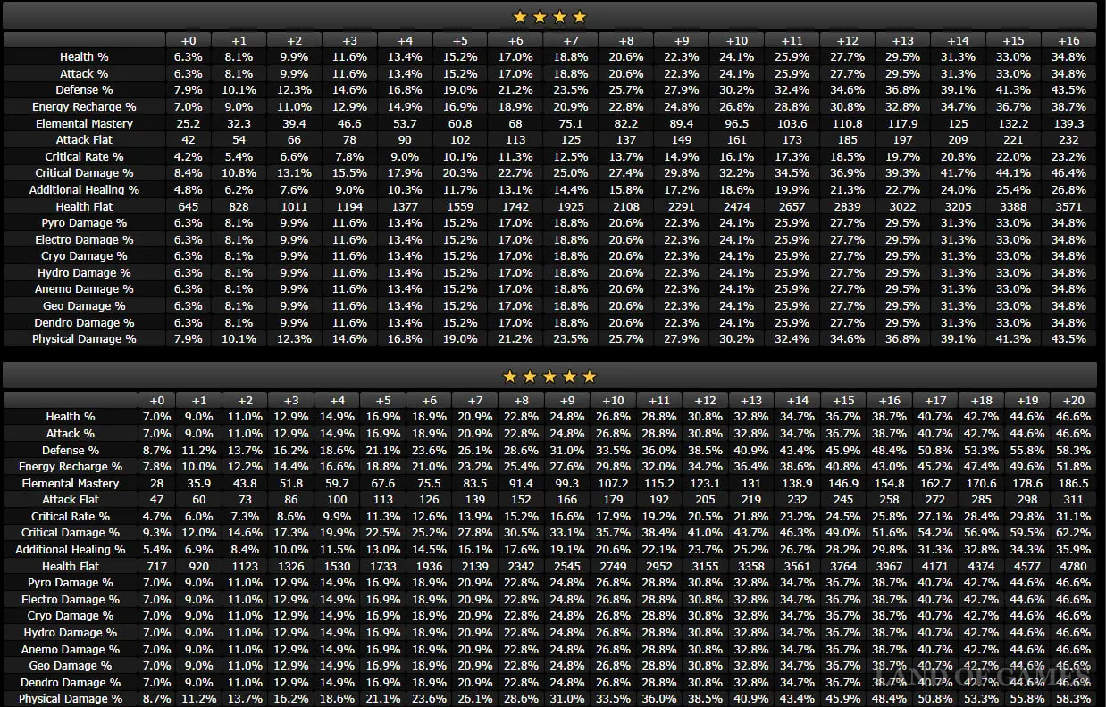 ХП%, Атака%, Защита%, МС, Урон одного из элементов%, Физ. урон% |