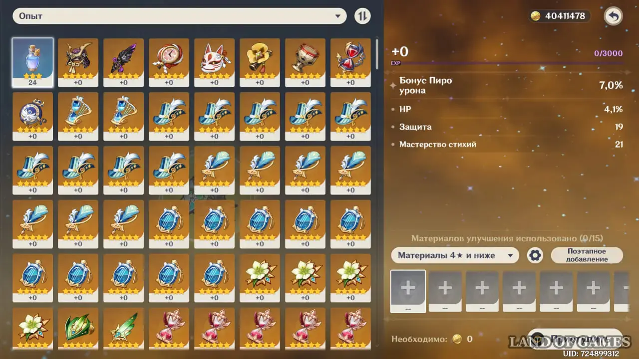 Для прокачки используются священные масла, эссенции или ненужные артефакты. Масла и эссенции выдают в награду в БП, некоторых ивентах и боевых режимах; кроме того, их можно приобрести у Пухляша в Чайнике безмятежности.