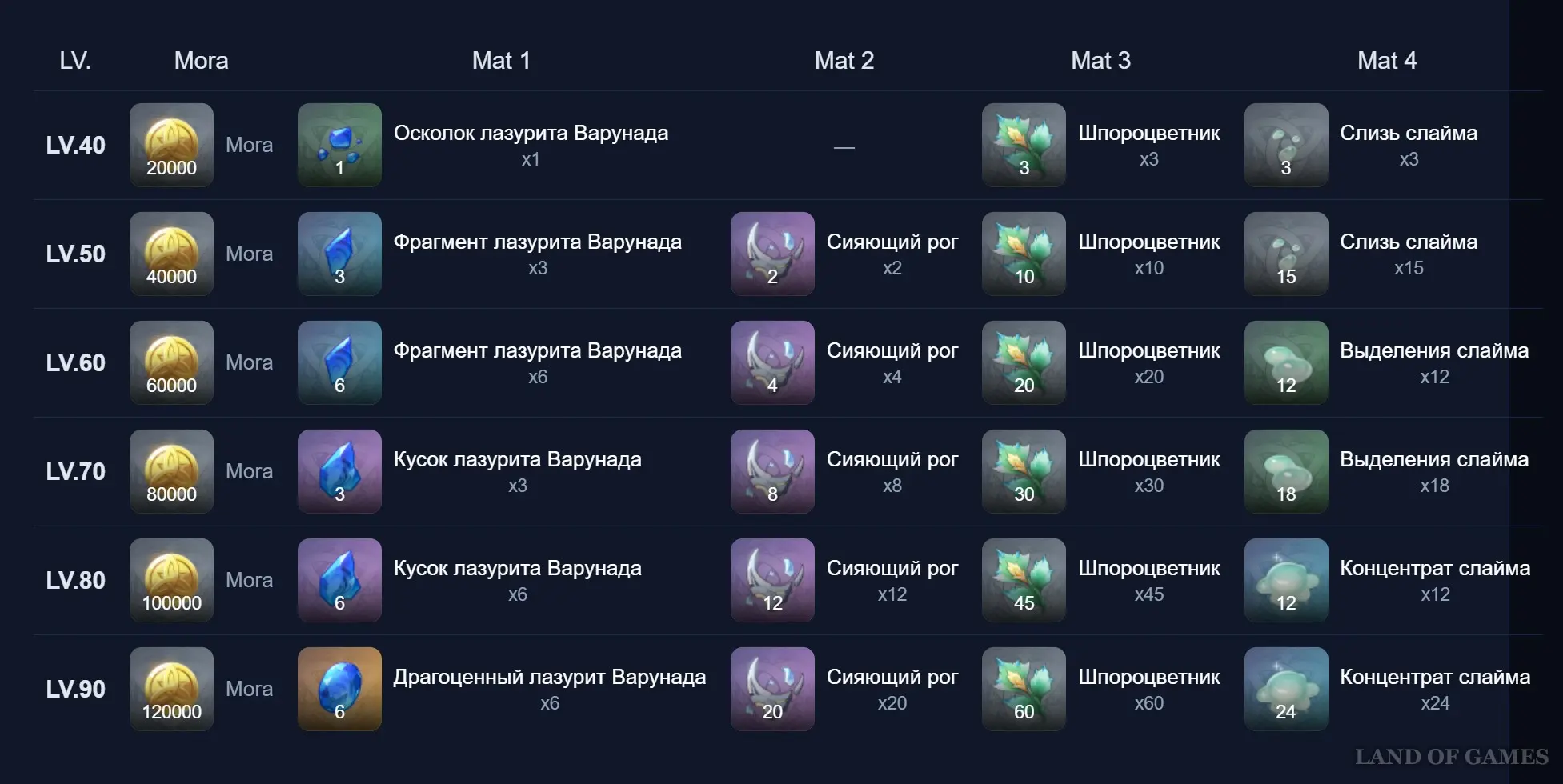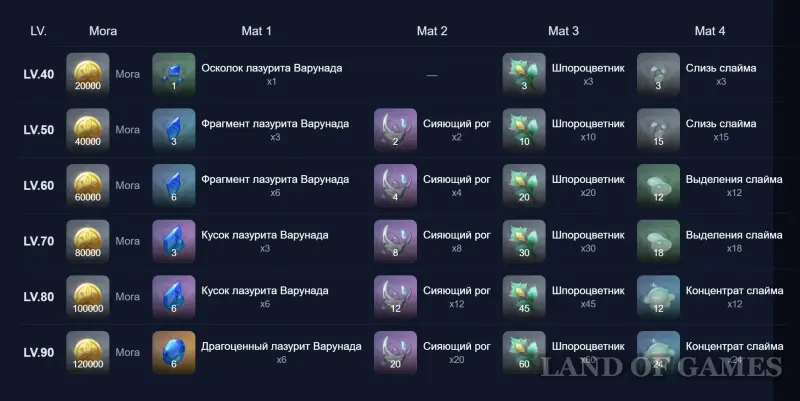 Добыть лазурит Варунада можно с Океанида, Двалина, Древнего Геовишапа, Гидро Гипостазиса и Аждахи. Они также продаются в сувенирной лавке. Сияющие рога выпадают с Повелителя морозной ночи. Шпороцветник является местной диковиной Нод-Края. В отдельном гайде мы указали его расположение.