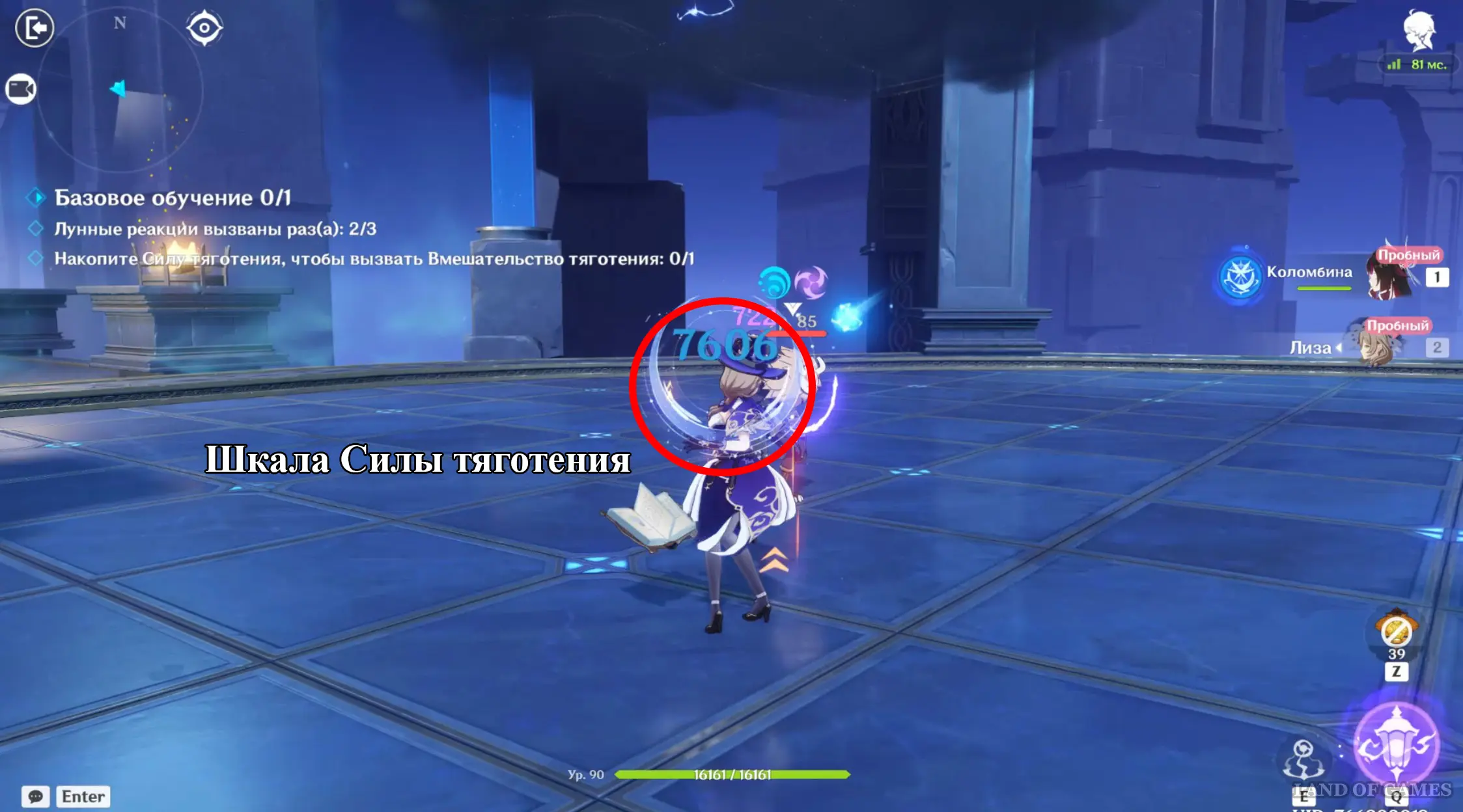 Уже одно это превращает Коломбину в неплохого аппликатора, однако, это еще не все. Дело в том, что при вызове лунных реакций или нанесении ими урона Зыбь начнет накапливать 10 единиц Силы тяготения в секунду. Максимум можно набрать 60 очков, то есть это удастся сделать за 6 секунд (следить за этим можно с помощью полумесяца за спиной активного героя, который начнет заполняться соответствующим образом).