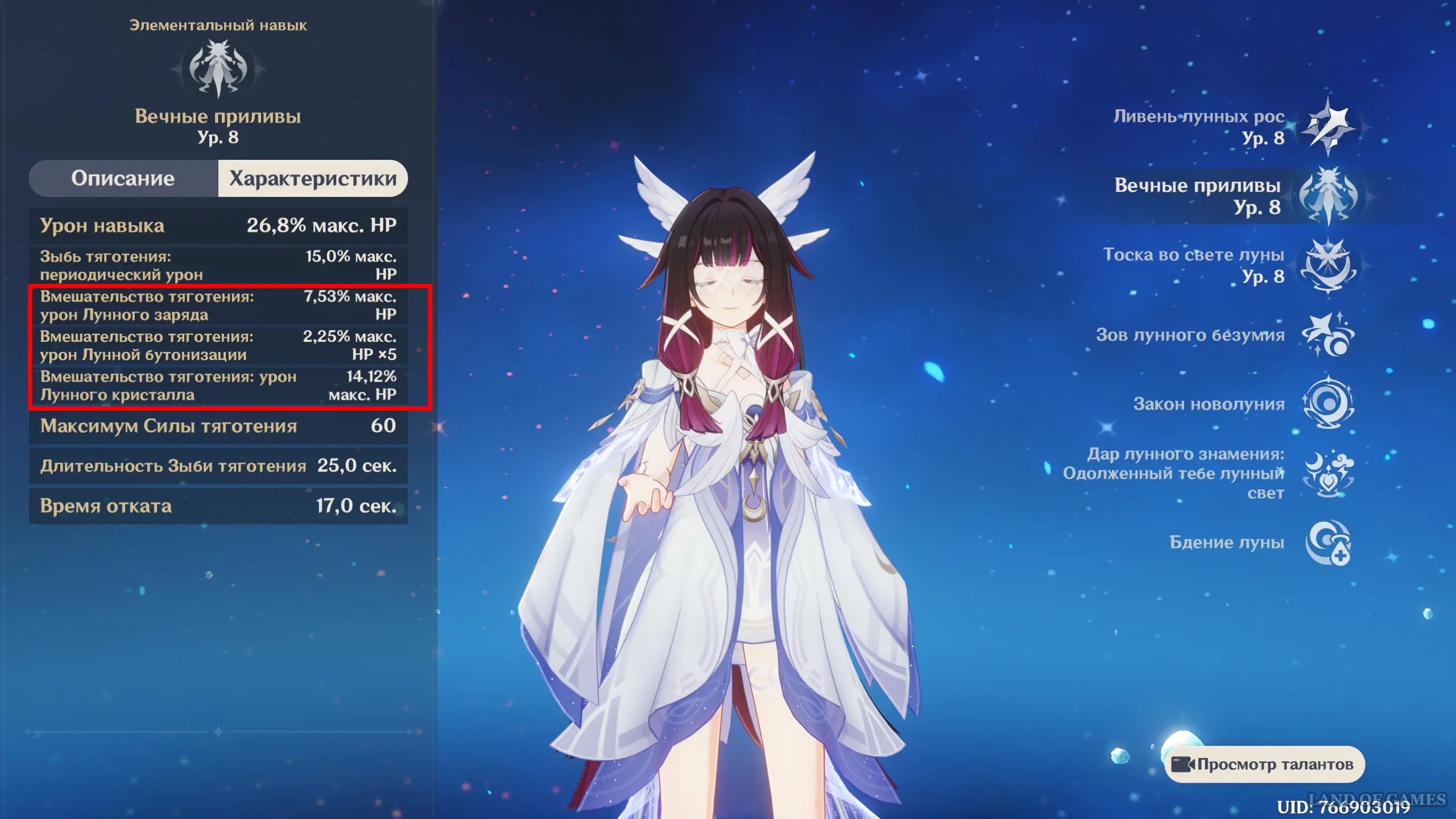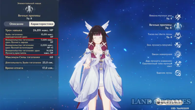 Отметим, что при действии Лунного знамения: Высшее сияние Зыбь тяготения будет наносить Гидро урон по большей площади, охватывая больше врагов.