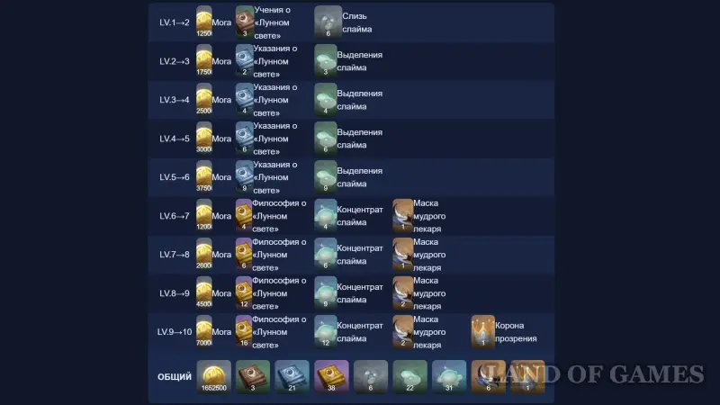 - Учения, указания и философии о «Лунном свете» – добываются по понедельникам, четвергам и воскресеньям в подземелье «Столица непроглядной тьмы».
