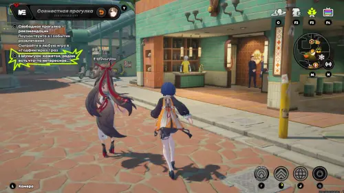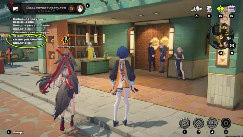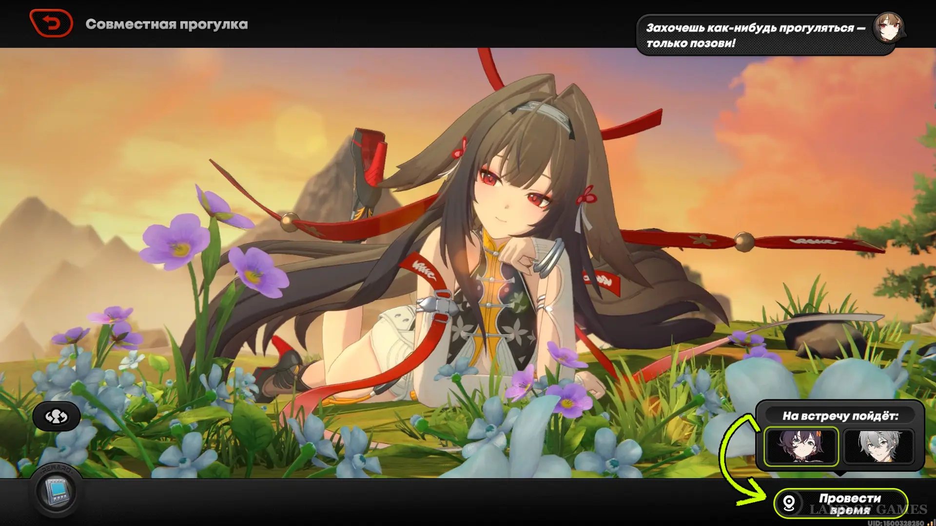 Режим «Совместной прогулки» не привязан к приглашениям в чате и может быть запущен неограниченное количество раз. Зайдите в чат с Е Шуньгуан и кликните по одноименной кнопке, чтобы попасть в отдельное меню (она появится после получения зеленого ранга Симпатии). Тут показаны живые обои, снизу есть значок с наградами и действие «Провести время» – жмем и выбираем место встречи (прогулки с прописанным сценарием помечаются квестовой меткой; после первого прохождения всех пяти свиданий, их сюжет можно повторить, выбрав во всплывающем меню над списком доступных локаций).