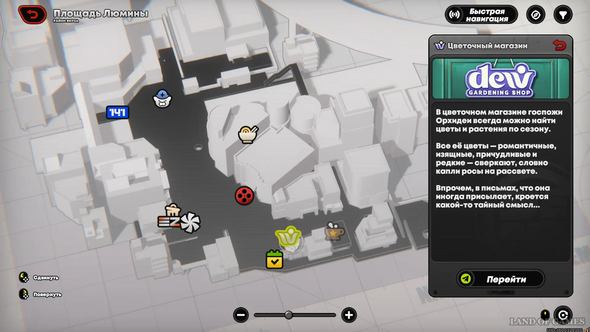 Выполнив 12 заказов флориста в рамках события «О сокровенном на языке цветов», вы разблокируете вход в цветочную лавку «Рассветная роса». Пригласите сяо-Гуан на свободную прогулку по площади Люмины, зайдите в магазинчик Орхидеи и составьте цветочную композицию (букет собирается автоматически, награда: 5 тысяч денни).