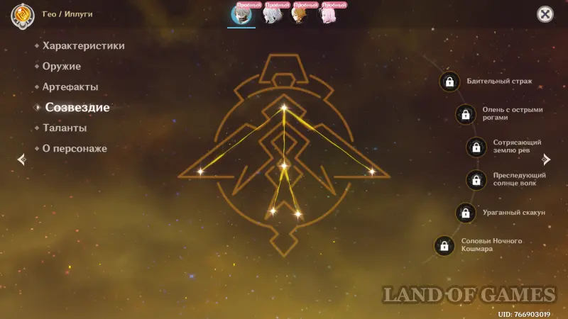 В целом Иллуги обладает неплохими созвездиями, а учитывая, что до них сравнительно легко добраться, мы советуем вам постараться открыть хотя бы С1 и С2, чтобы герою было проще активировать ульту по откату, и он получил возможность наносить Гео урон из кармана. Однако по-настоящему отличным саппортом для Гео отрядов его сделает только С6.