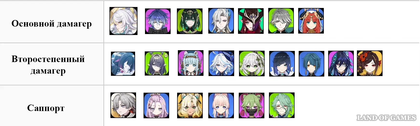 | Мейн-ДД | Саб-ДД | Саб-ДД/Поддержка | Поддержка |