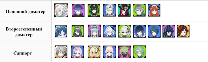 Как обычно, саб-ДД и саппорты (включая хиллеров и щитовиков) могут быть любых стихий. Главное, чтобы они были способны регулярно наносить элементальный урон из кармана и давать мощные баффы мейн-ДД соответственно.