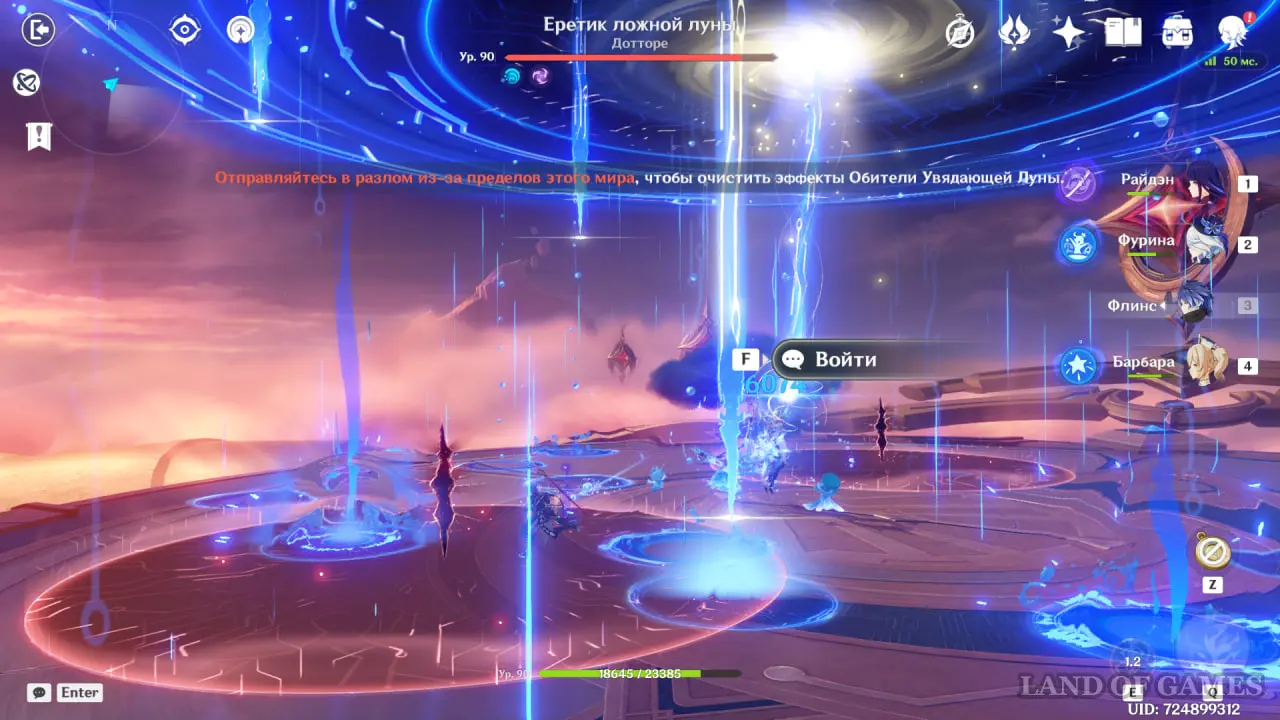 Босс периодически будет создавать 3 входа в разломы. В это время на поле боя вас будут атаковать теневые копии, а пространства вокруг входа в разлом наносят Крио урон.