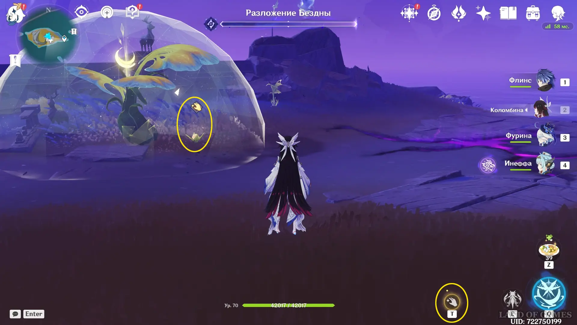 Первым делом избавимся от разложения бездны на острове. Напротив заблокированных сундуков есть купол цветка духов и несколько мандрагор – возьмите одну из них и киньте в шпилецвет (показан на третьем скриншоте выше), а после заберите у засиявшего цветка защитный навык (на T).