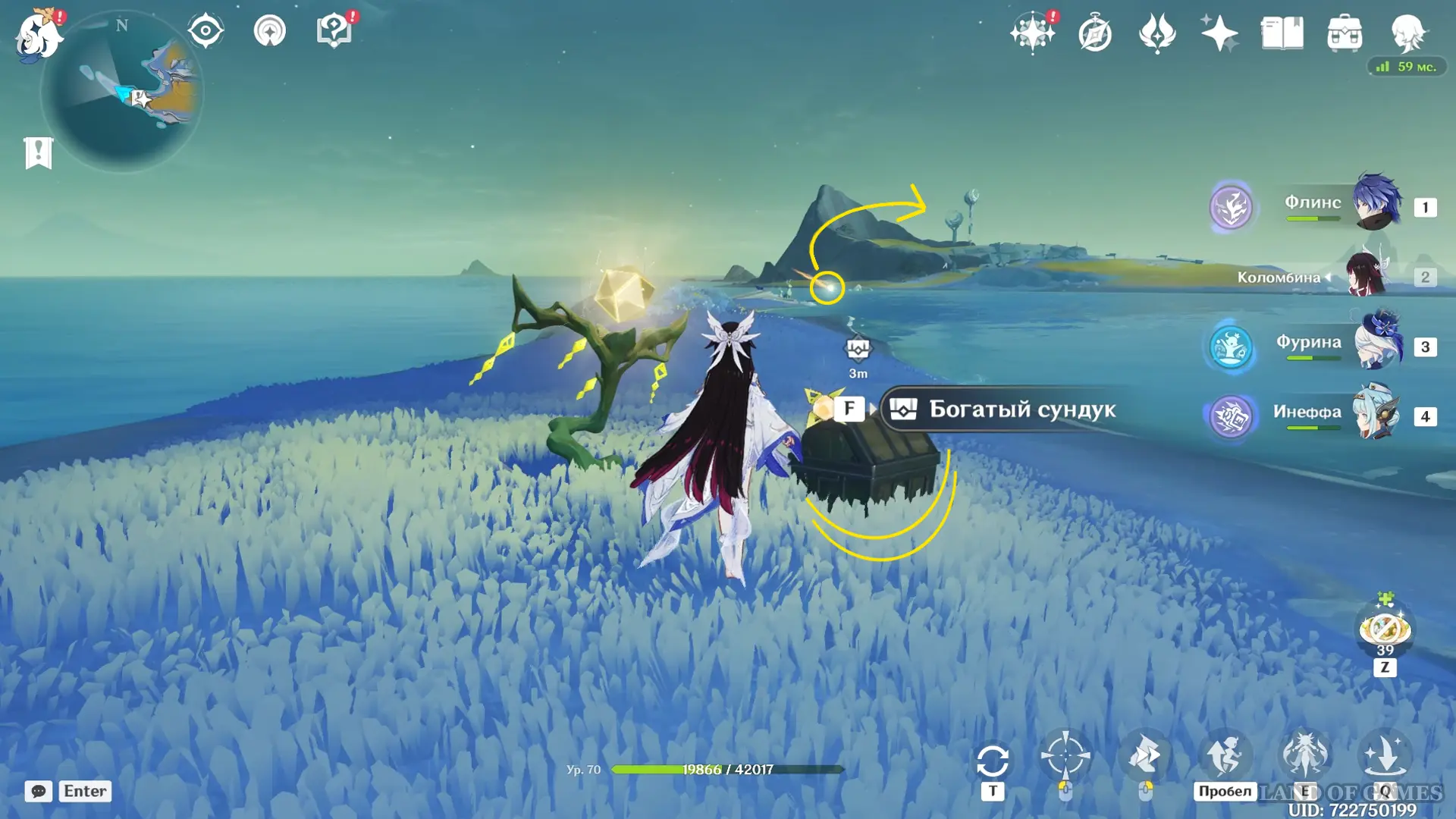 Когда все три куухенки вернутся на остров и активируют лунные колонны, около сундуков появится путь наверх (первый скриншот выше) – активируйте его и прокатитесь по кругу над островом, чтобы стать обладателем ачивки «Холм в лунном свете» (+5 примогемов из раздела «Чудеса света»), а также разблокировать драгоценный и роскошный сундуки.