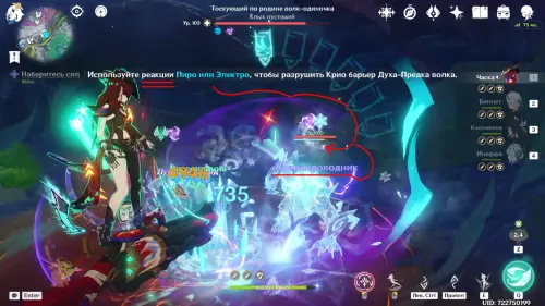 «Ярость волков» — ключевой прием противника. Если вовремя прервать атаку или уничтожить призванного двойника, босс будет временно обездвижен. Важно отметить, что для уничтожения духа недостаточно просто бить Пиро или Электро — требуется вызвать соответствующие элементальные реакции, такие как Заряжен, Перегрузка или постоянное Рассеивание этих стихий (его частично дает главный волк, но этого недостаточно).