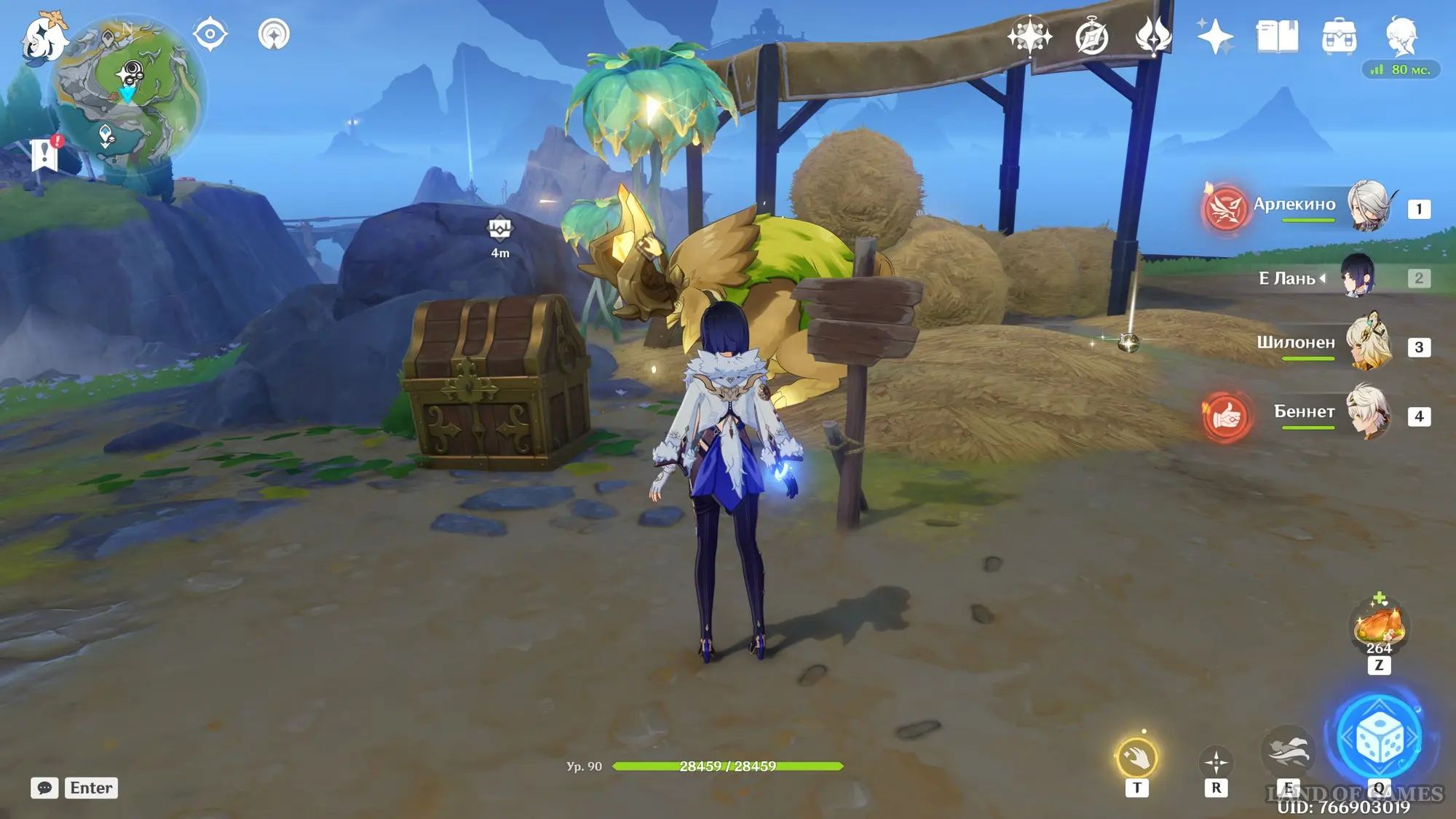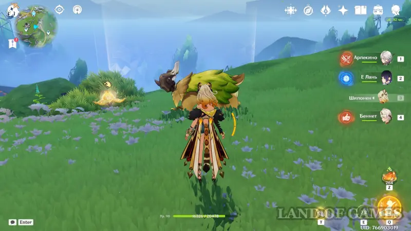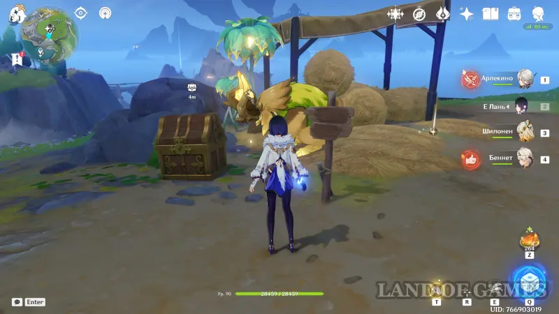 Начните бежать назад к кипам сена и деревянной табличке. Следите за овечкой, чтобы не убежать от нее слишком далеко, иначе связь разорвется. По пути на вас нападут хиличурлы, но вы можете не обращать на них внимания, пока не доберетесь до драгоценного сундука, который тут же разблокируется, как только вы оставите овечку возле сена (клавиша «Q»).