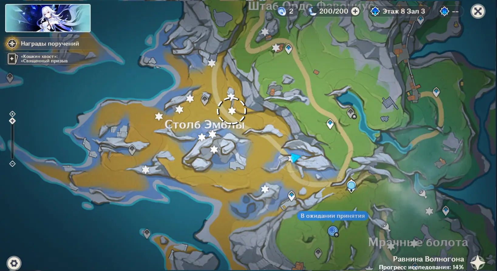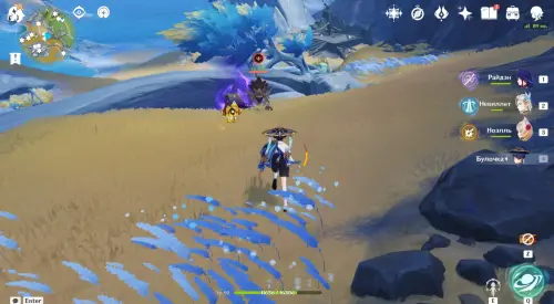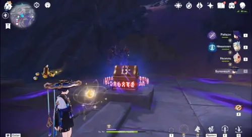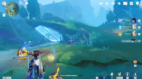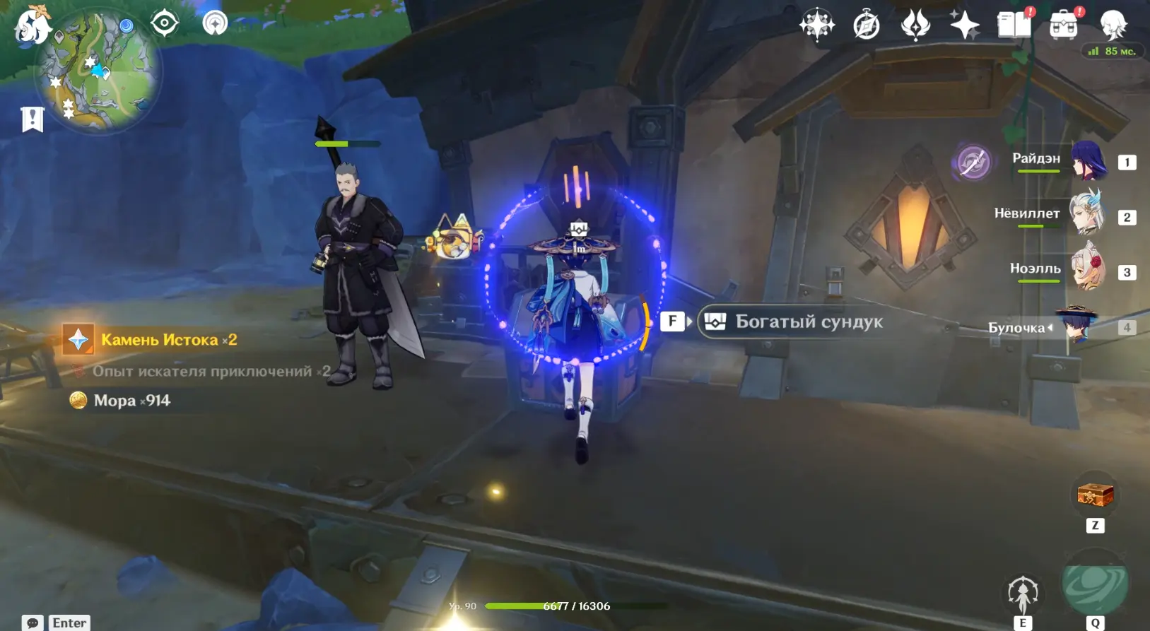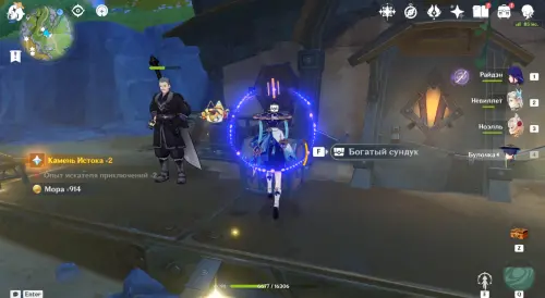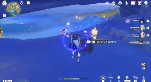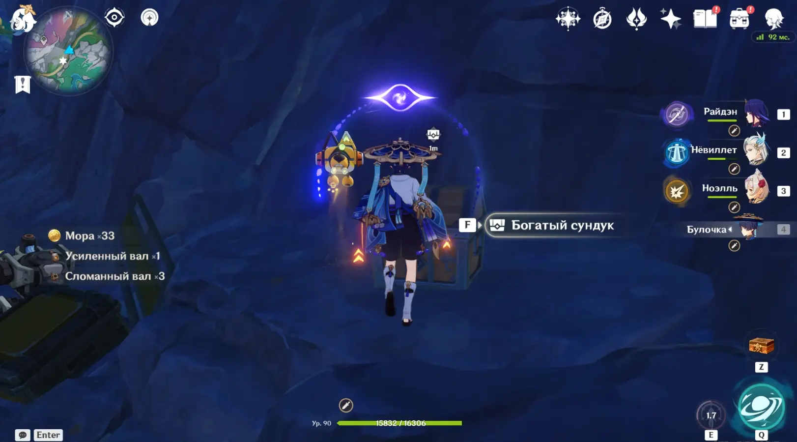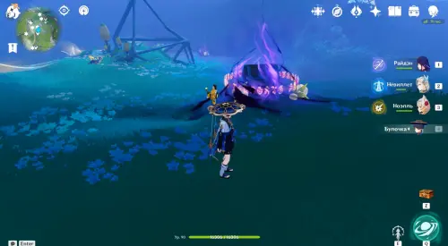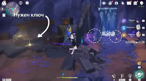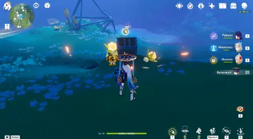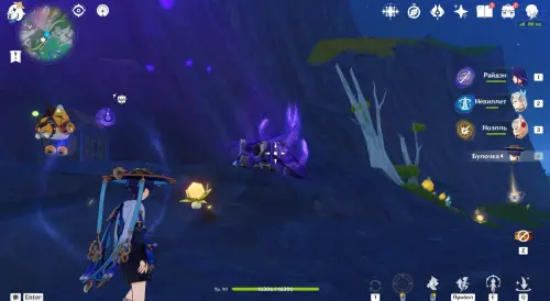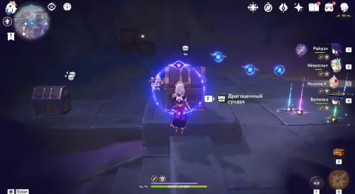 Ниже того же телепорта ратники сражаются с рыболовами скрытых глубин. Подберите шпилецвет и уничтожьте линии разлома над врагами. После победы станет доступен богатый сундук.