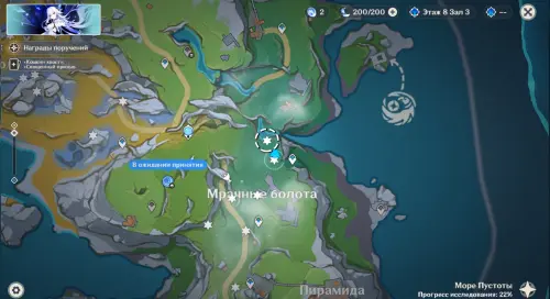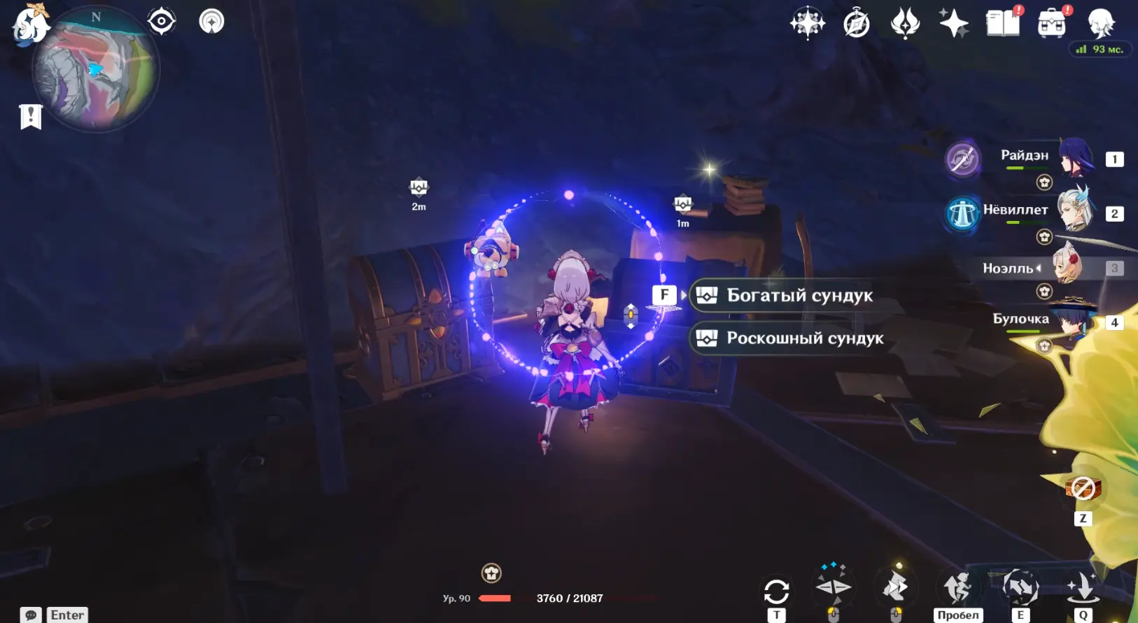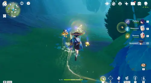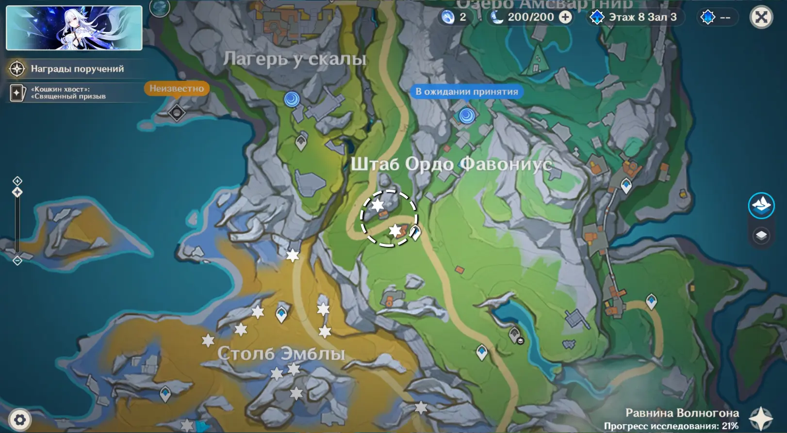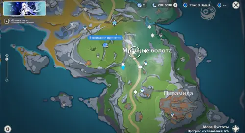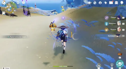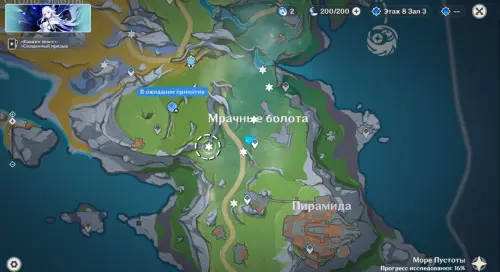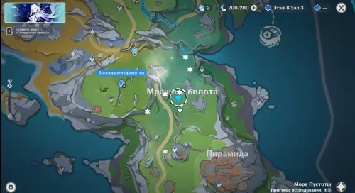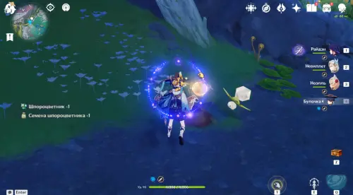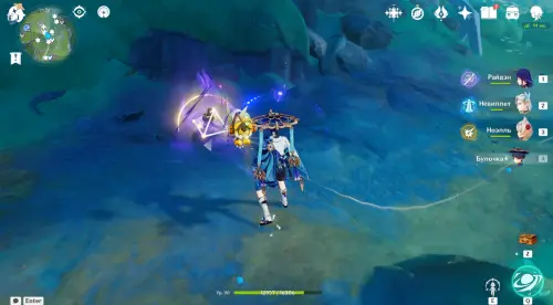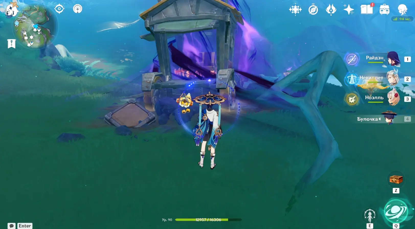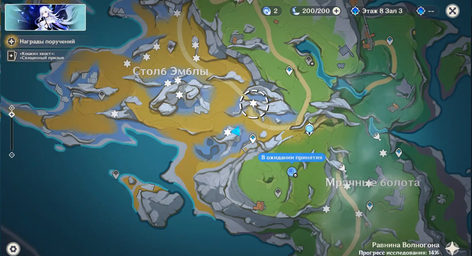 Ниже того же телепорта ратники сражаются с рыболовами скрытых глубин. Подберите шпилецвет и уничтожьте линии разлома над врагами. После победы станет доступен богатый сундук.