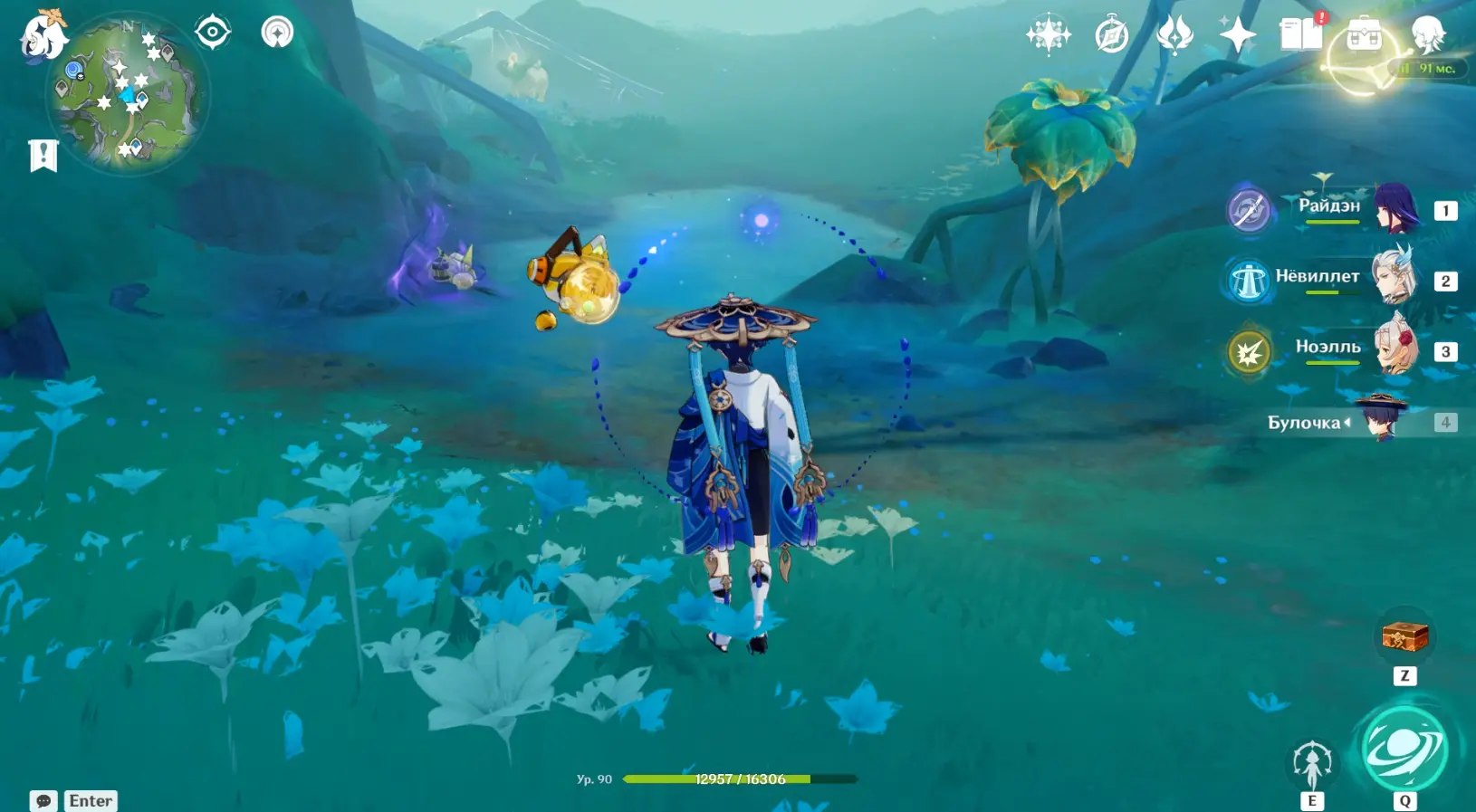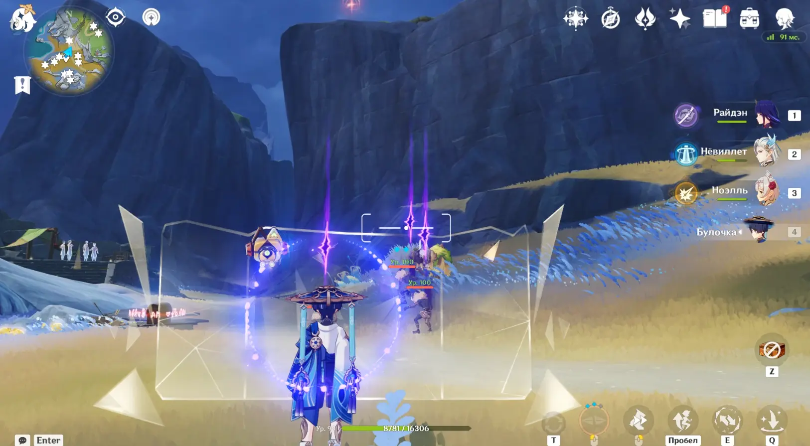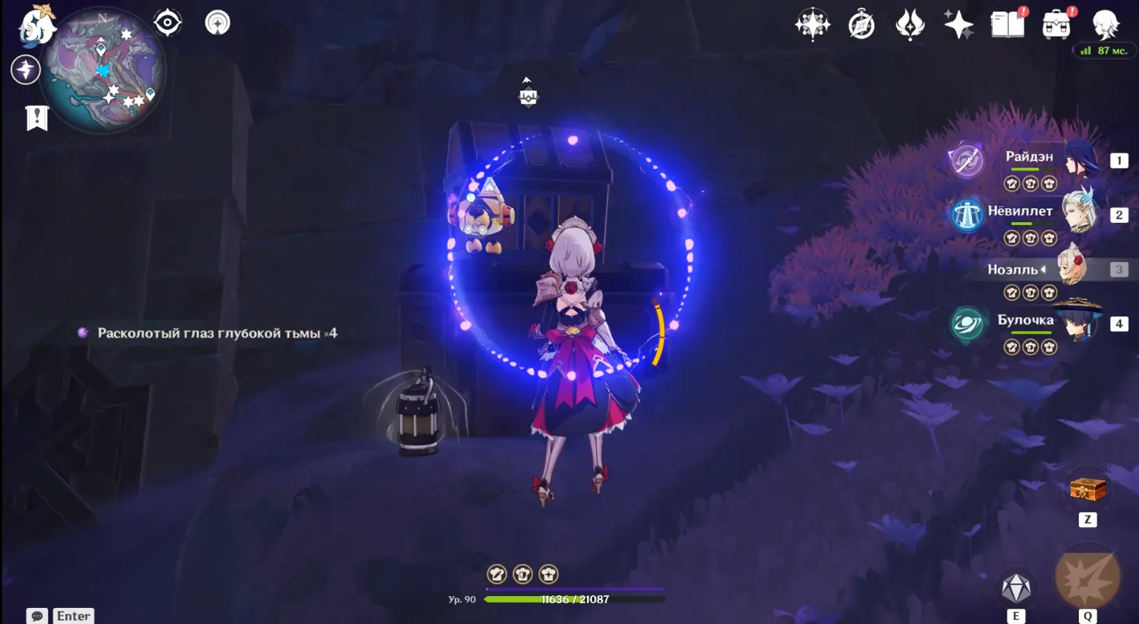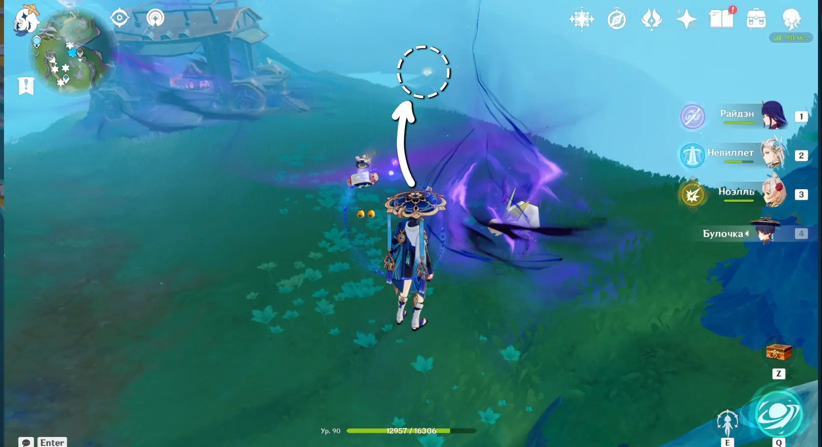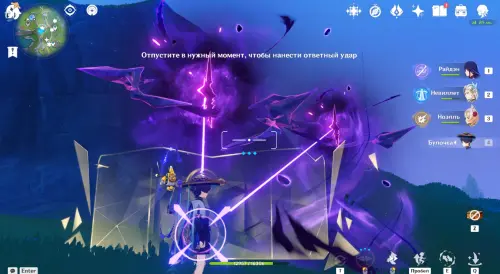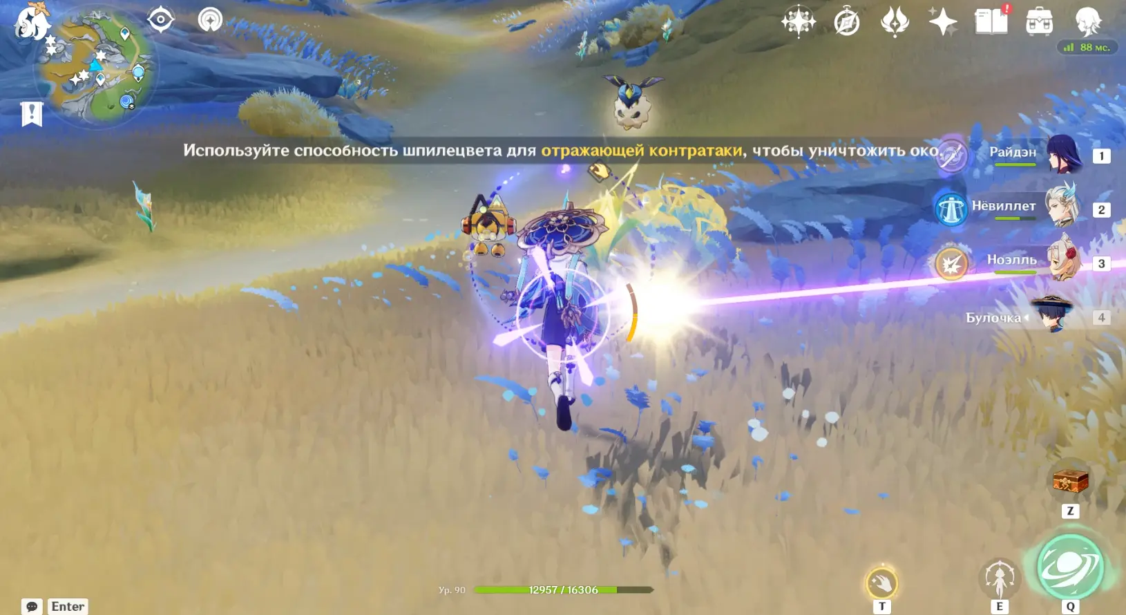 Возьмите шпилецвет снова и удерживайте ЛКМ, отпуская в момент, когда атака Ока ударит по щиту. Отраженные удары уничтожат сущности. В награду получаем богатый сундук.