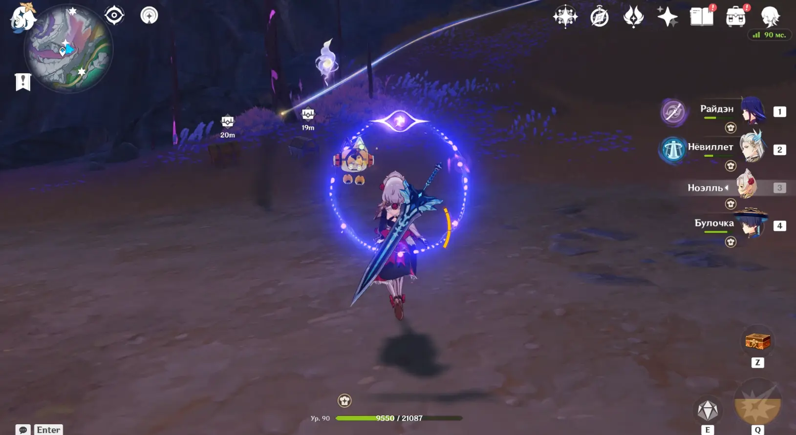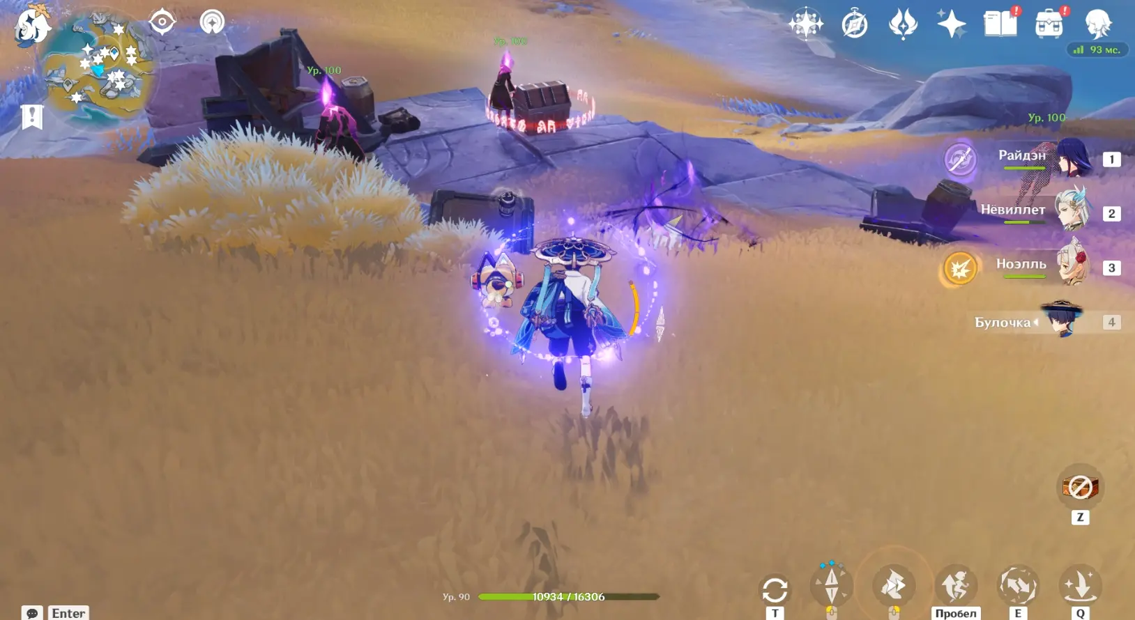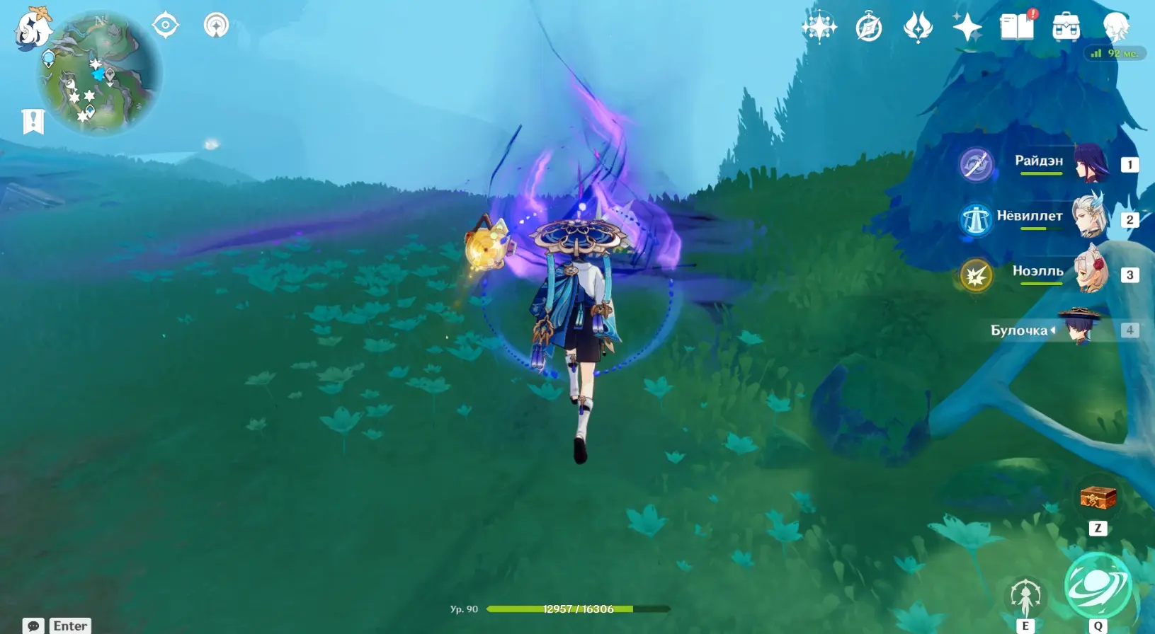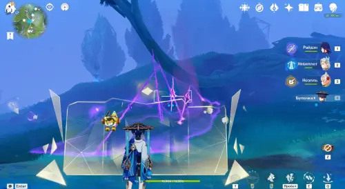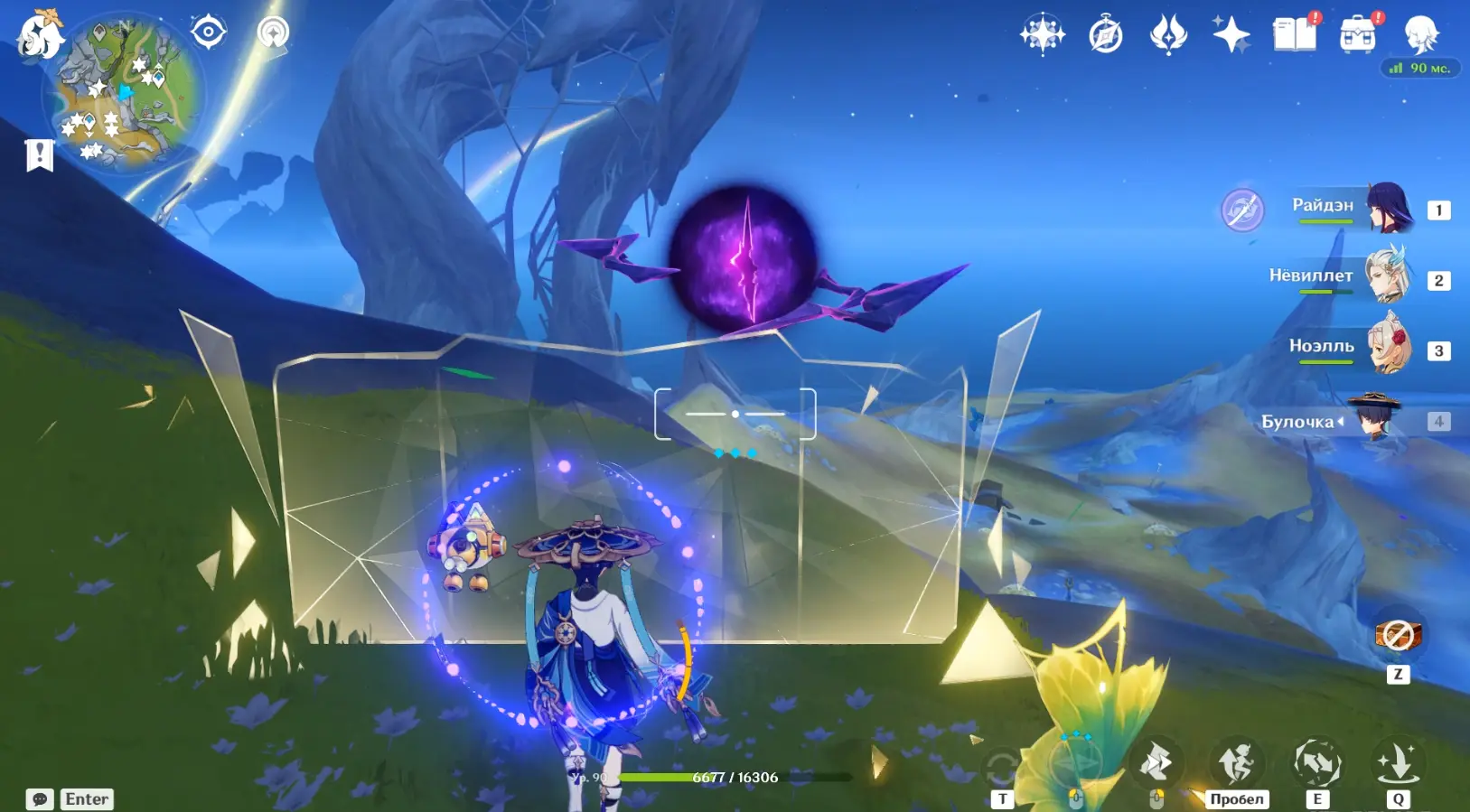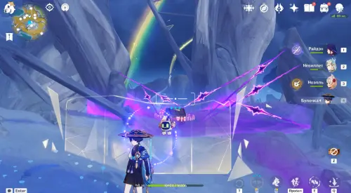Возьмите шпилецвет снова и удерживайте ЛКМ, отпуская в момент, когда атака Ока ударит по щиту. Отраженные удары уничтожат сущности. В награду получаем богатый сундук.