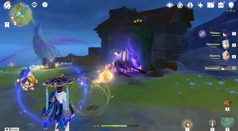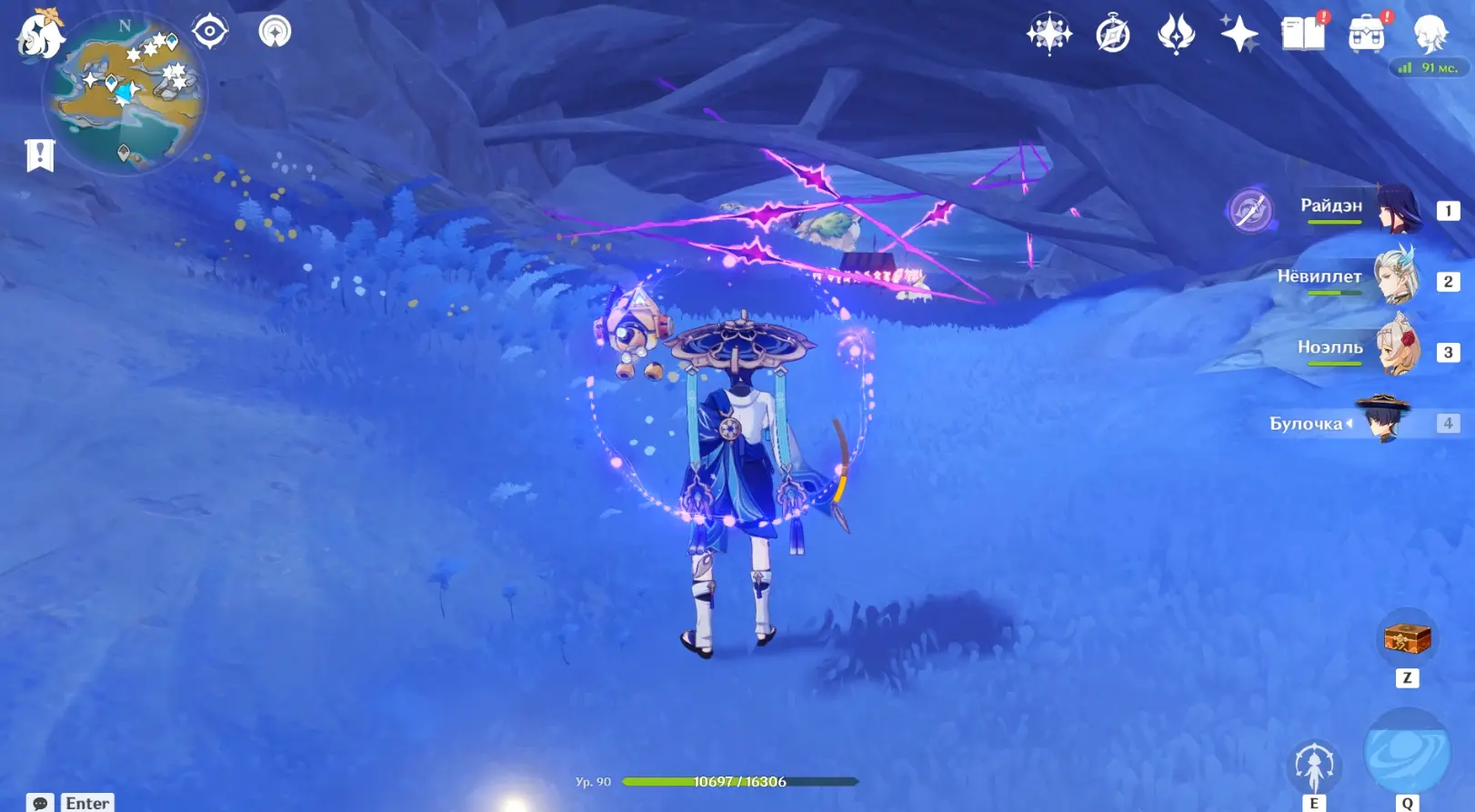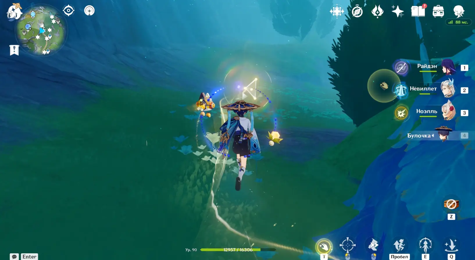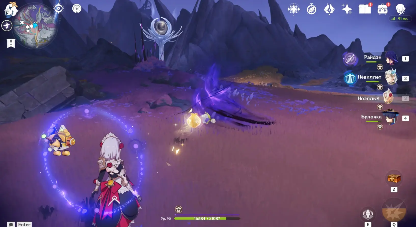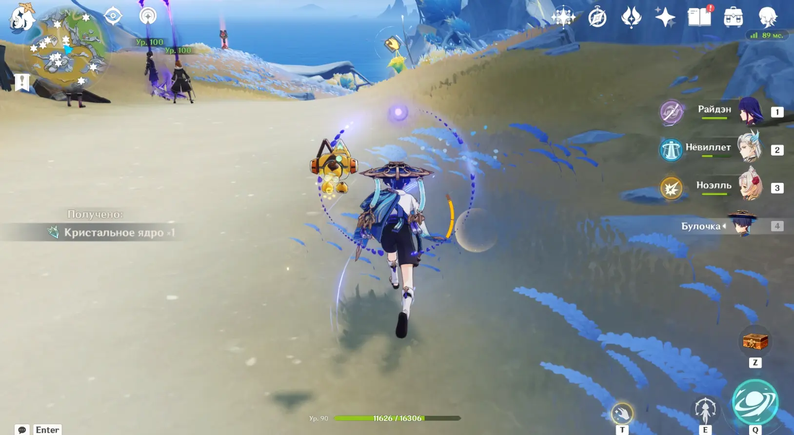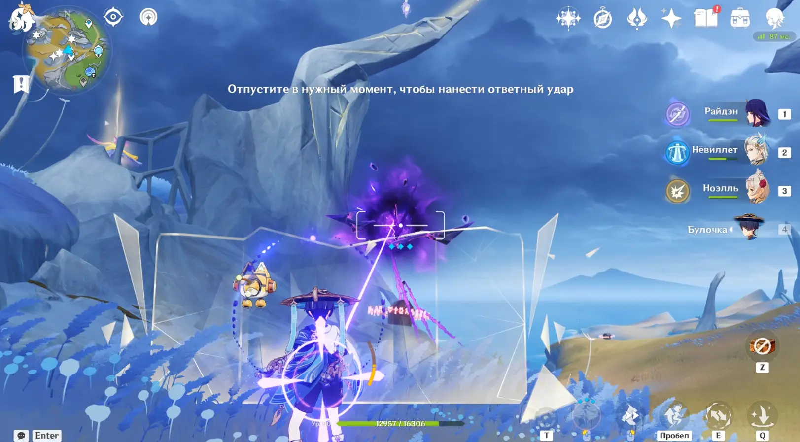 Возьмите шпилецвет снова и удерживайте ЛКМ, отпуская в момент, когда атака Ока ударит по щиту. Отраженные удары уничтожат сущности. В награду получаем богатый сундук.