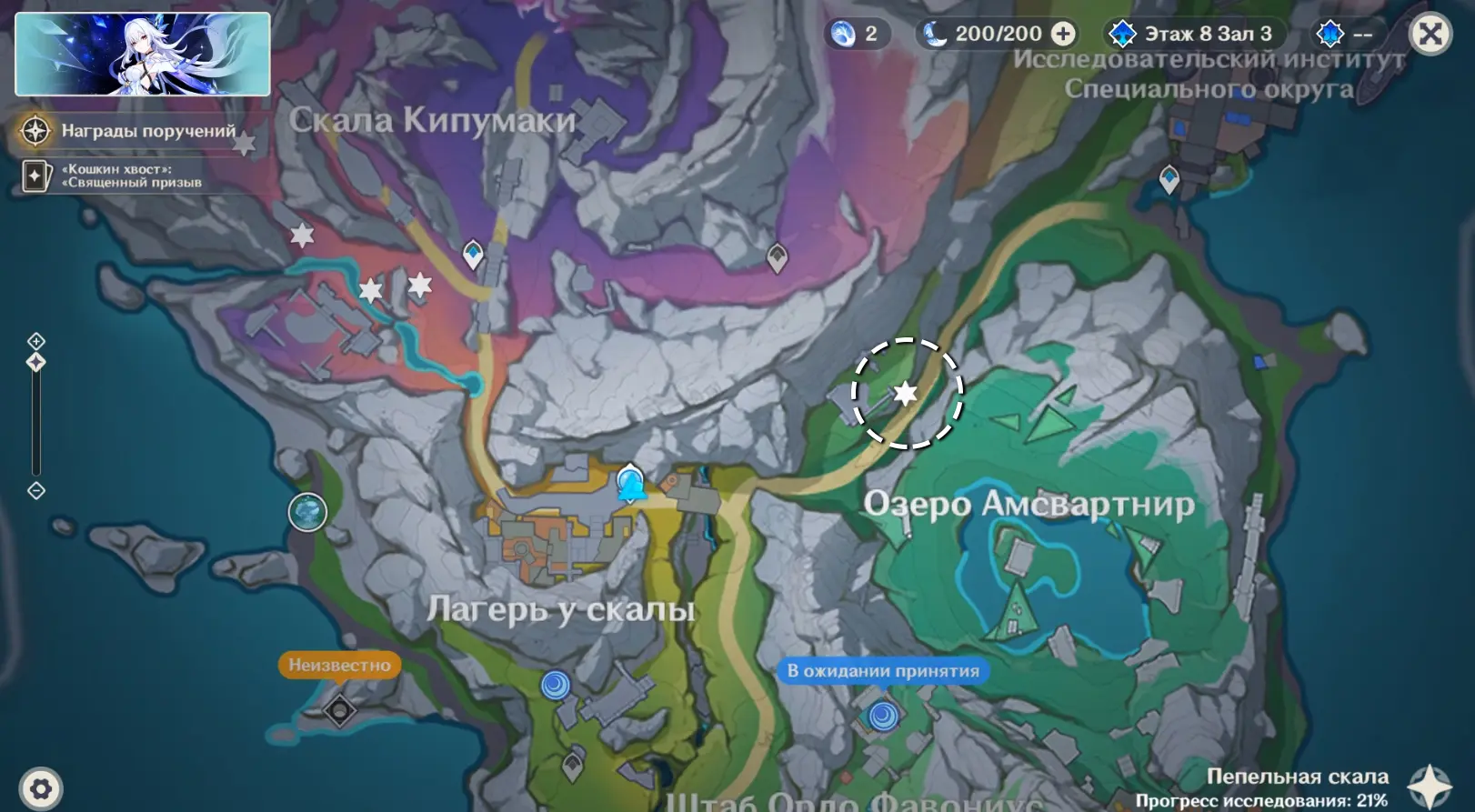 От статуи Богини Луны двигайтесь выше Озера Амсвартнир. В норе справа прячется хорек с мандрагорой. Возьмите ее, очистите зараженное растение выше, затем поднимитесь к зараженному шпилецвету. Спланируйте вниз, победите Фатуи, заберите богатый сундук и очистите еще одно существо. После этого станет доступен драгоценный сундук. Мы в деталях рассказали о решении этой загадки в отдельном гайде.