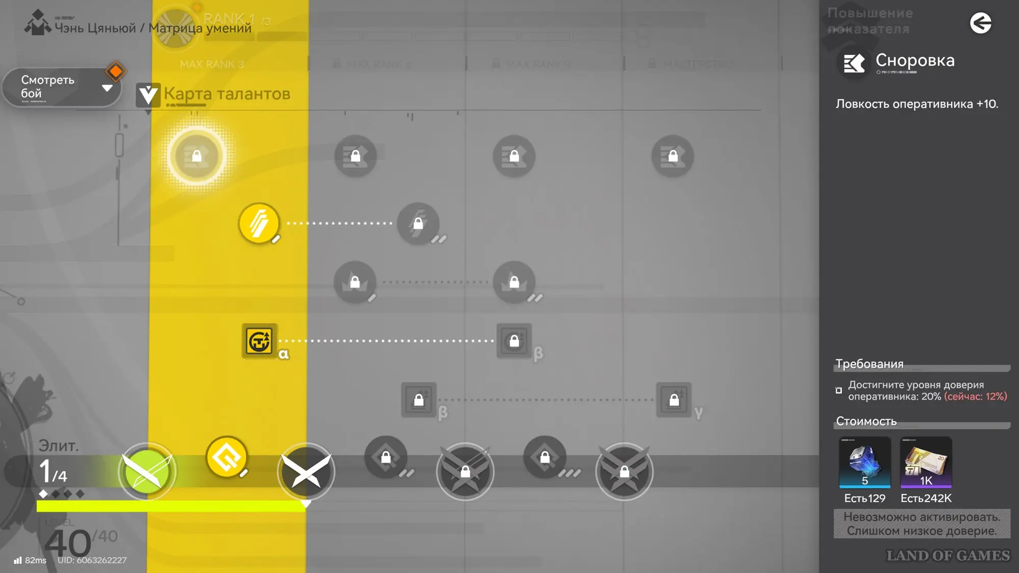 Если вы загляните в Матрицу умений любого своего оперативника в обзорном меню, а потом перейдете на Карту талантов, то увидите здесь 4 узла, повышающих основной показатель персонажа. При этом доступ к ним открывается при достижении уровня доверия в 20%, 50%, 100% и 100%. После этого нужно лишь потратить определенное количество Т-кредитов и прото-материалов, чтобы активировать их.