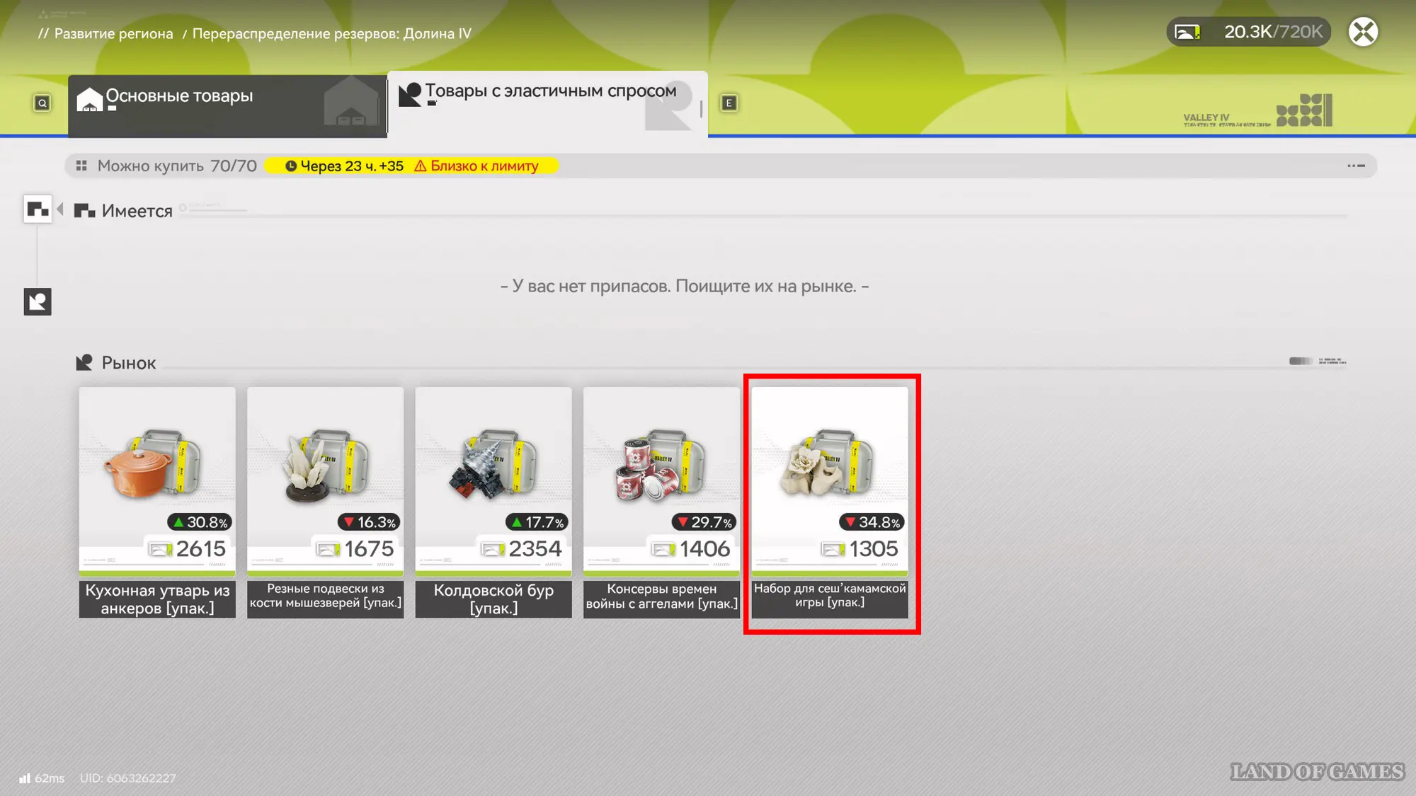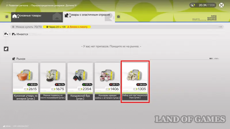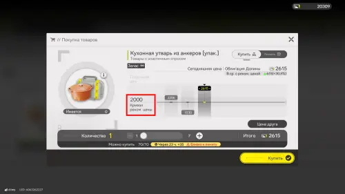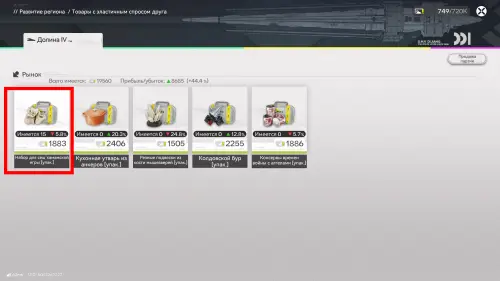 Учитывая вышеуказанную информацию, вы сможете крайне быстро заработать значительную сумму облигаций. Далее пошагово объясним, как это сделать. Перейдите в раздел товаров с эластичным спросом и выберите товар с самым большим снижением цены на данный момент, то есть в нашем случае это Набор для сеш’камамской игры, у которого цена от рекомендуемой ниже на 34,8%.