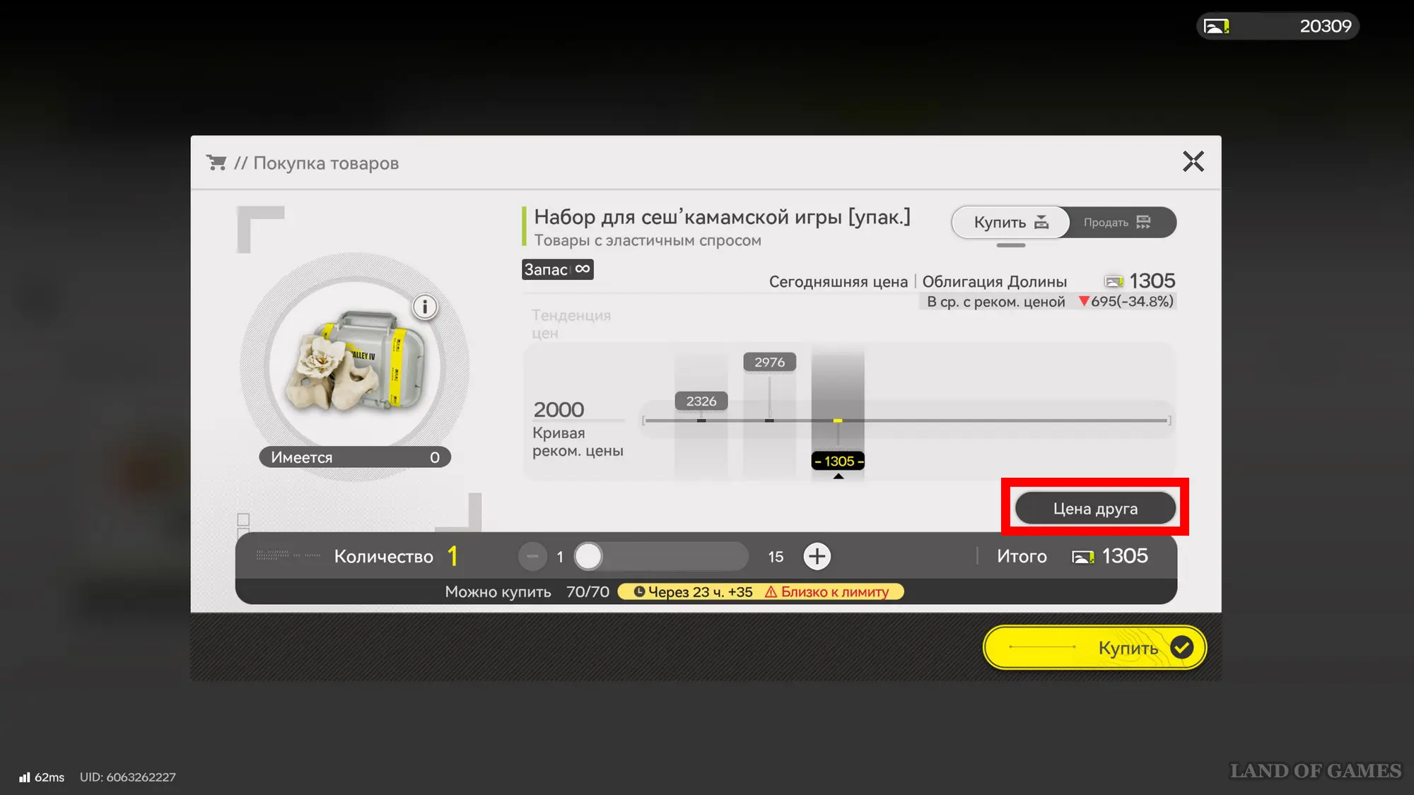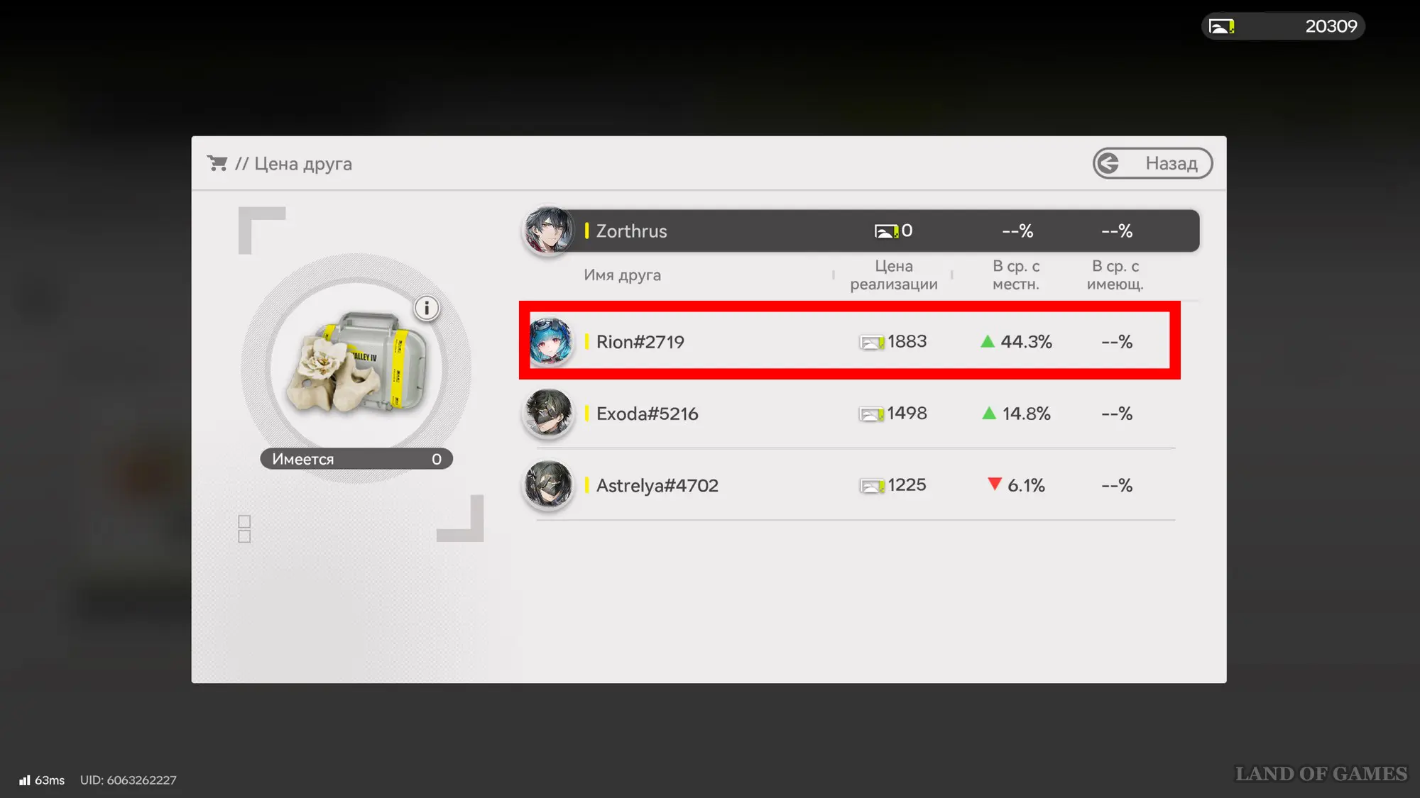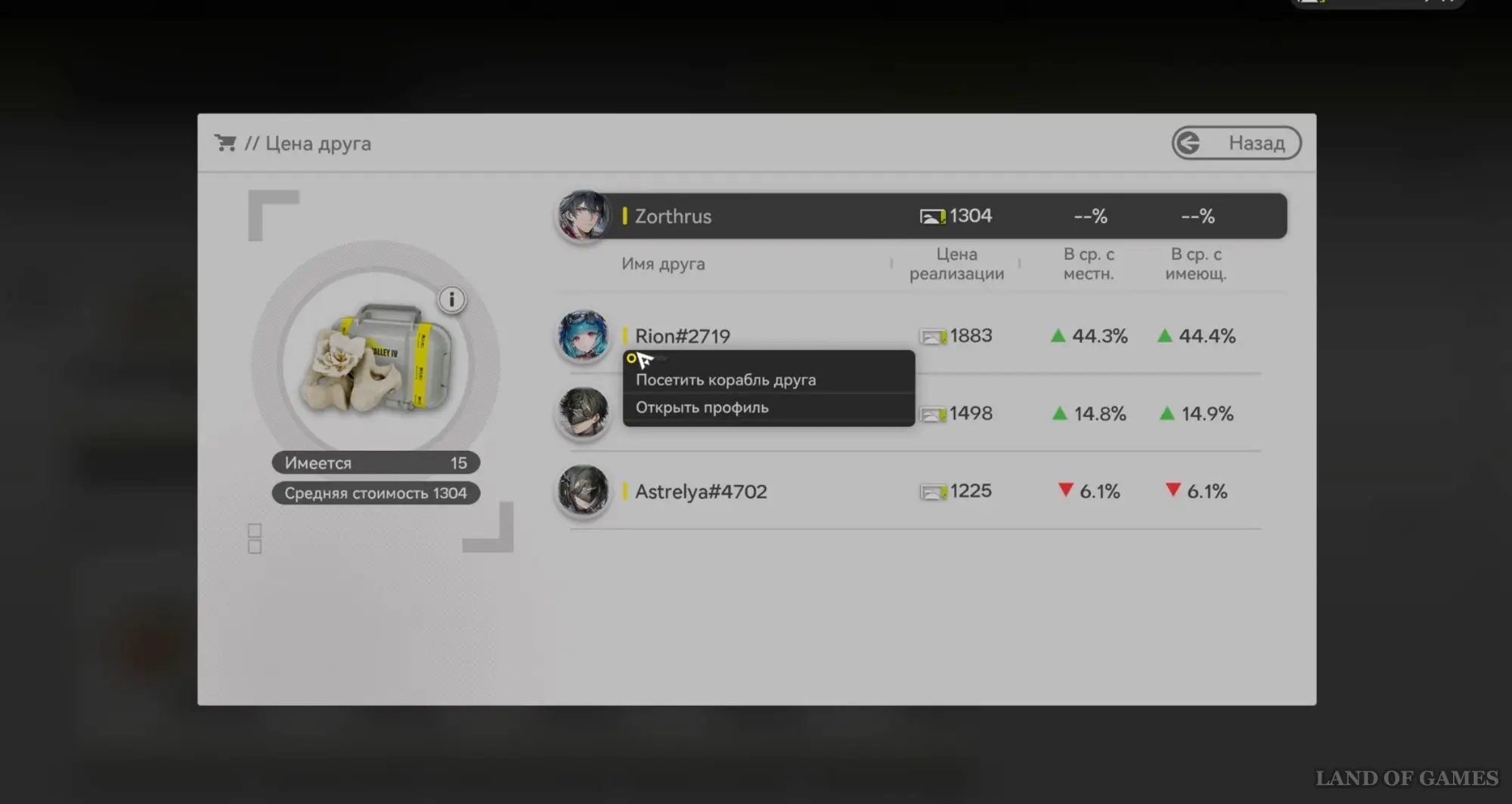 Нажмите на товар и в открывшемся окошке кликните по кнопке «Цена друга». В результате вы увидите список своих друзей и заметите, у кого из них данное изделие сейчас стоит дороже. Например, в нашем примере у Rion цена этого товара выше на 44,3%.