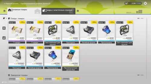 При этом следует также обратить внимание, что все товары здесь поделены на две группы: Ежедневные и Заводские. Первые в основном представляют собой материалы прокачки и представлены в больших количествах, а вторые являются оружием или уникальными устройствами, представленными в единичных экземплярах. При этом обе категории восполняются только при улучшении терминала.