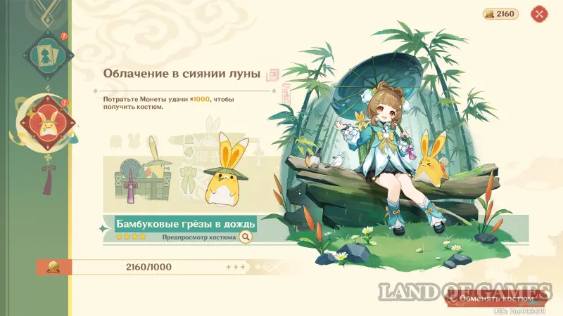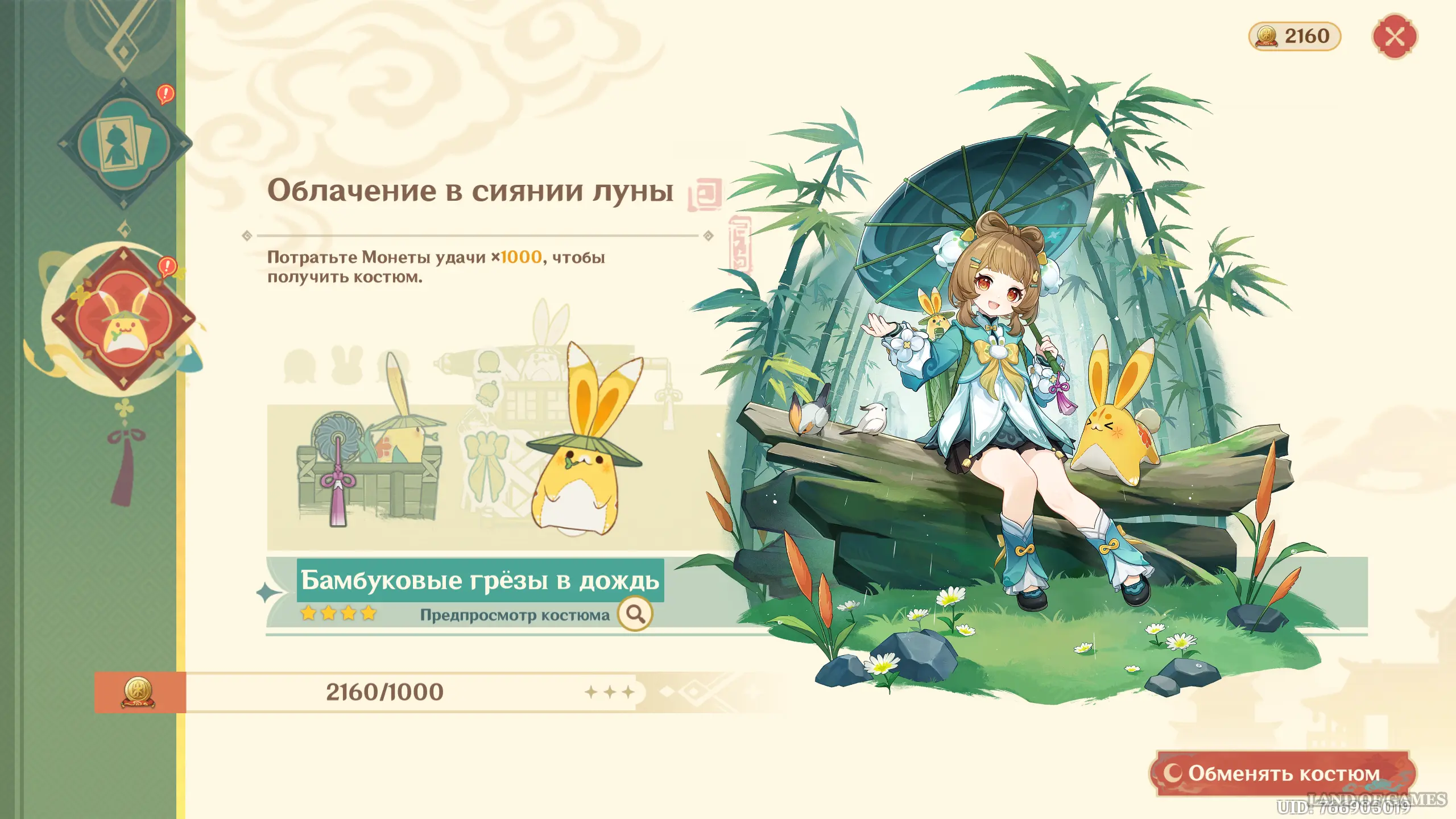 Для открытия облика «Бамбуковые грезы в дождь», предназначенного для Яо Яо вам необходимо будет собрать 1000 монет удачи. После этого вы сможете обменять их на нужный скин на страничке ивента. После завершения обновления 6.3 данный облик можно будет купить во внутриигровом магазине за 1680 кристаллов сотворения.