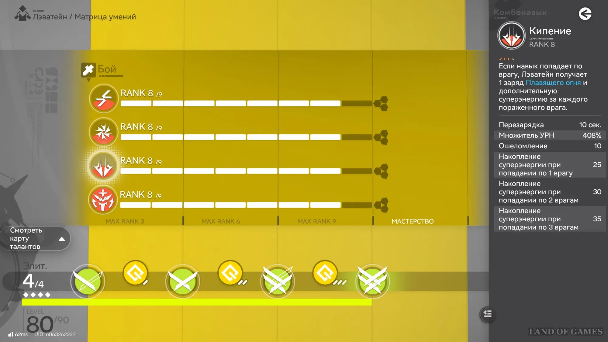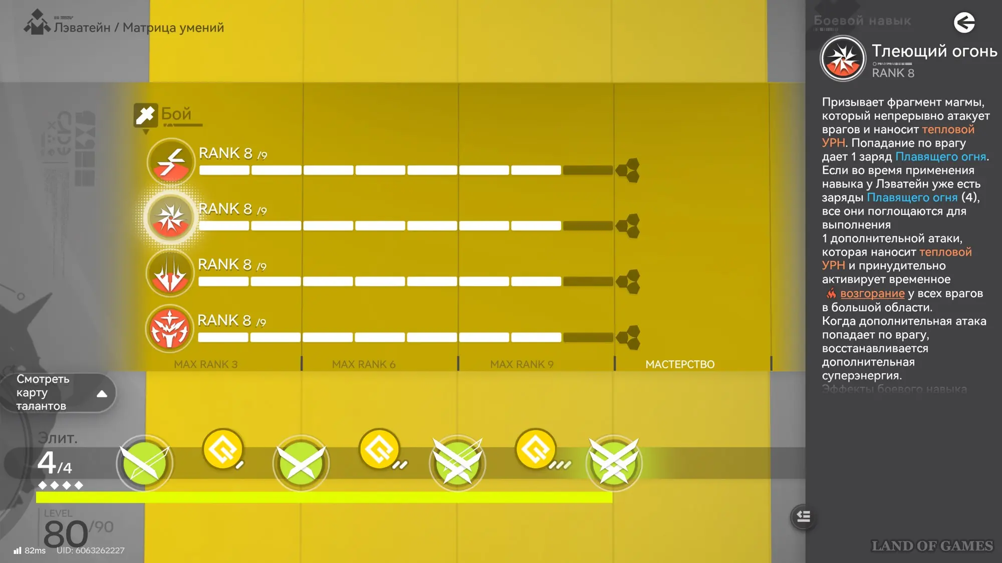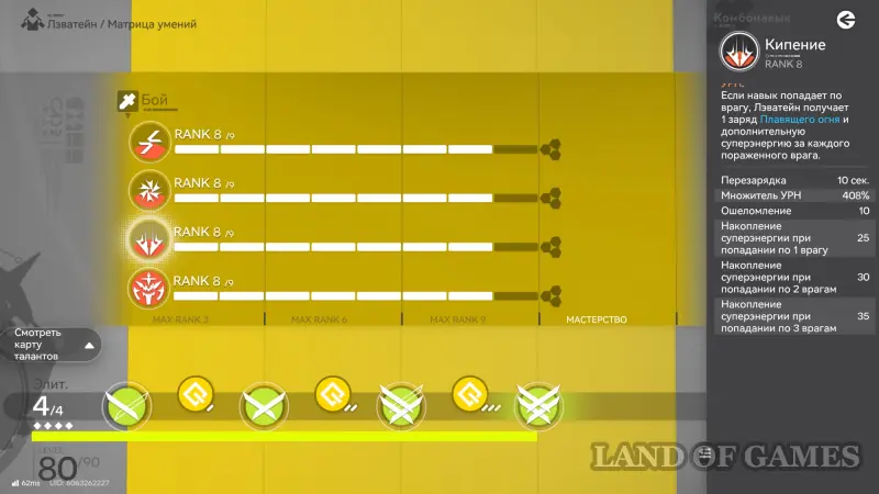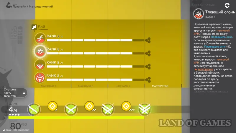 - Старайтесь активировать боевой навык Лэватейн только после набора 4 зарядов Плавящего огня, чтобы не только нанести повышенный урон и возгорание, но и получить сразу 100 энергии. Ваша главная цель – как можно быстрее набрать 300 энергии, дабы активировать ульту.