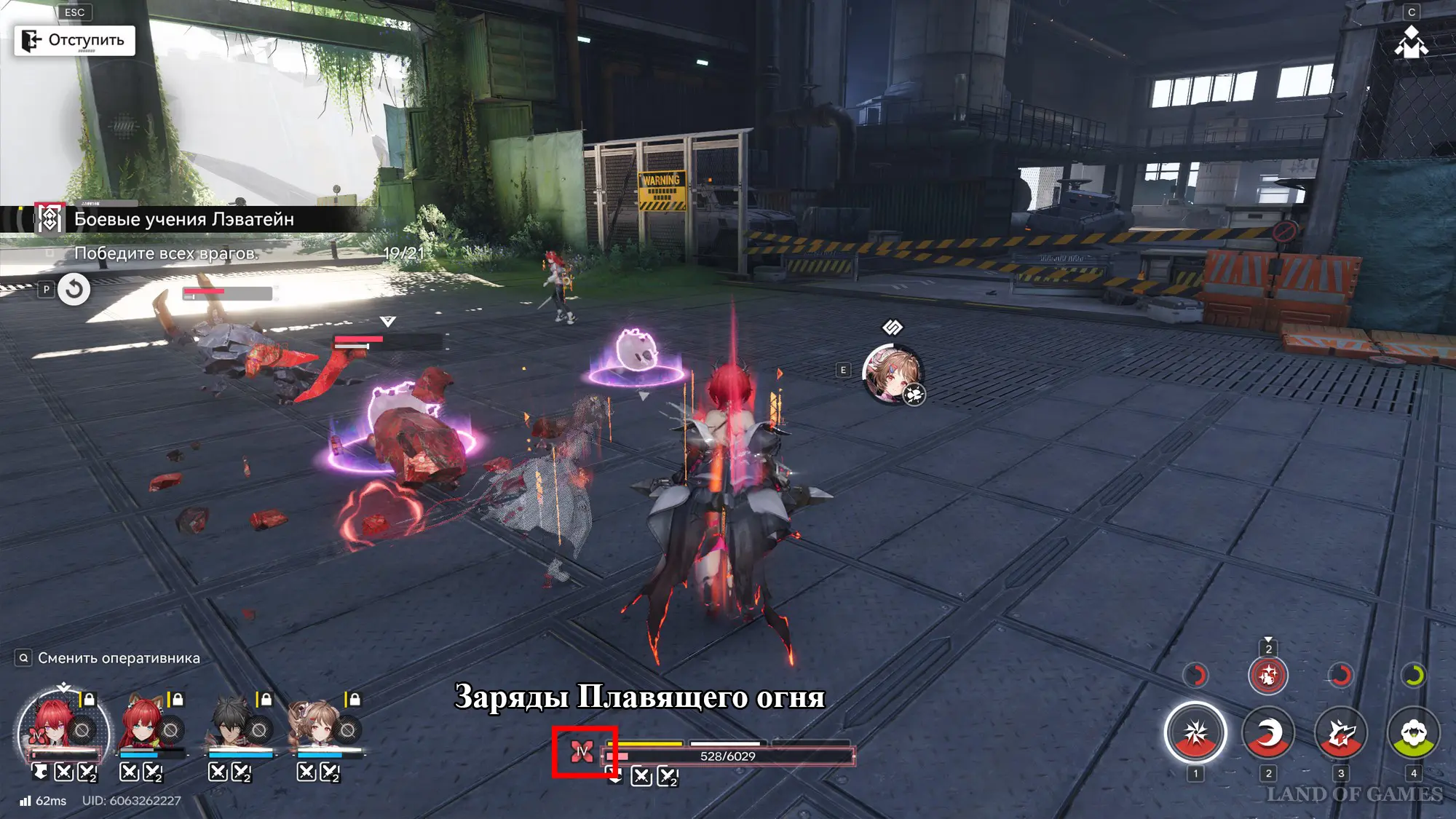 - В первой половине боя используйте боевые навыки и триггерите комбонавыки союзников, которые способны накладывать возгорание, коррозию и поражение теплом. Первые два эффекта помогут в вызове комбонавыка самой Лэватейн и генерации энергии. Последний же позволит оперативнице быстрее набирать стаки Плавящего огня.