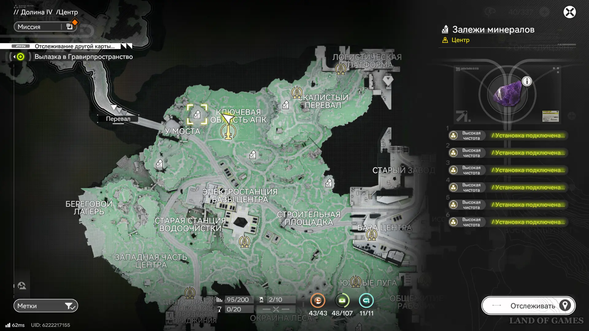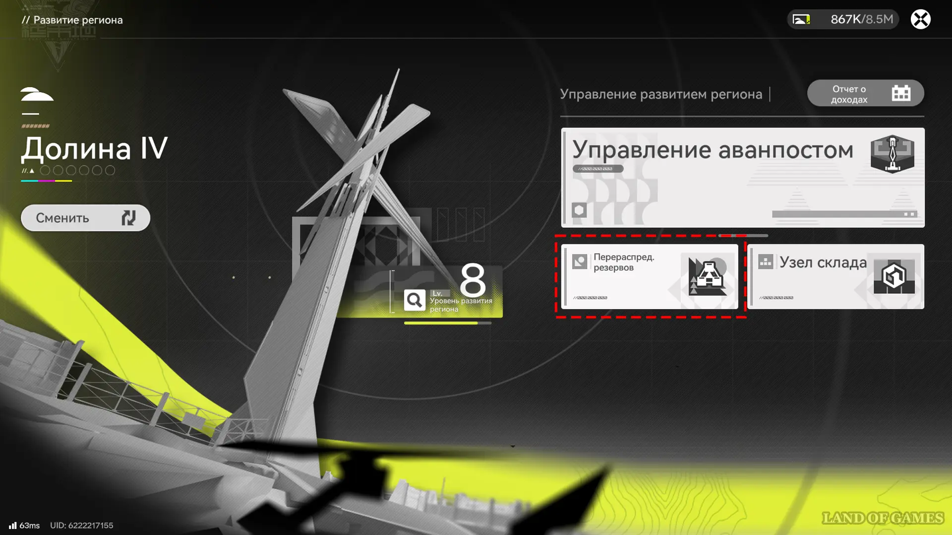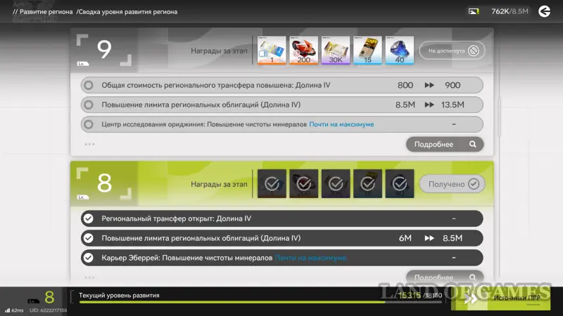Уровень развития региона напрямую усиливает добычу в АПК, повышая чистоту минералов и вместимость размещения сооружений. Чтобы зарабатывать больше очков развития, открывайте и разрабатывайте места добычи, улучшайте аванпосты, станции переработки и узлы склада.