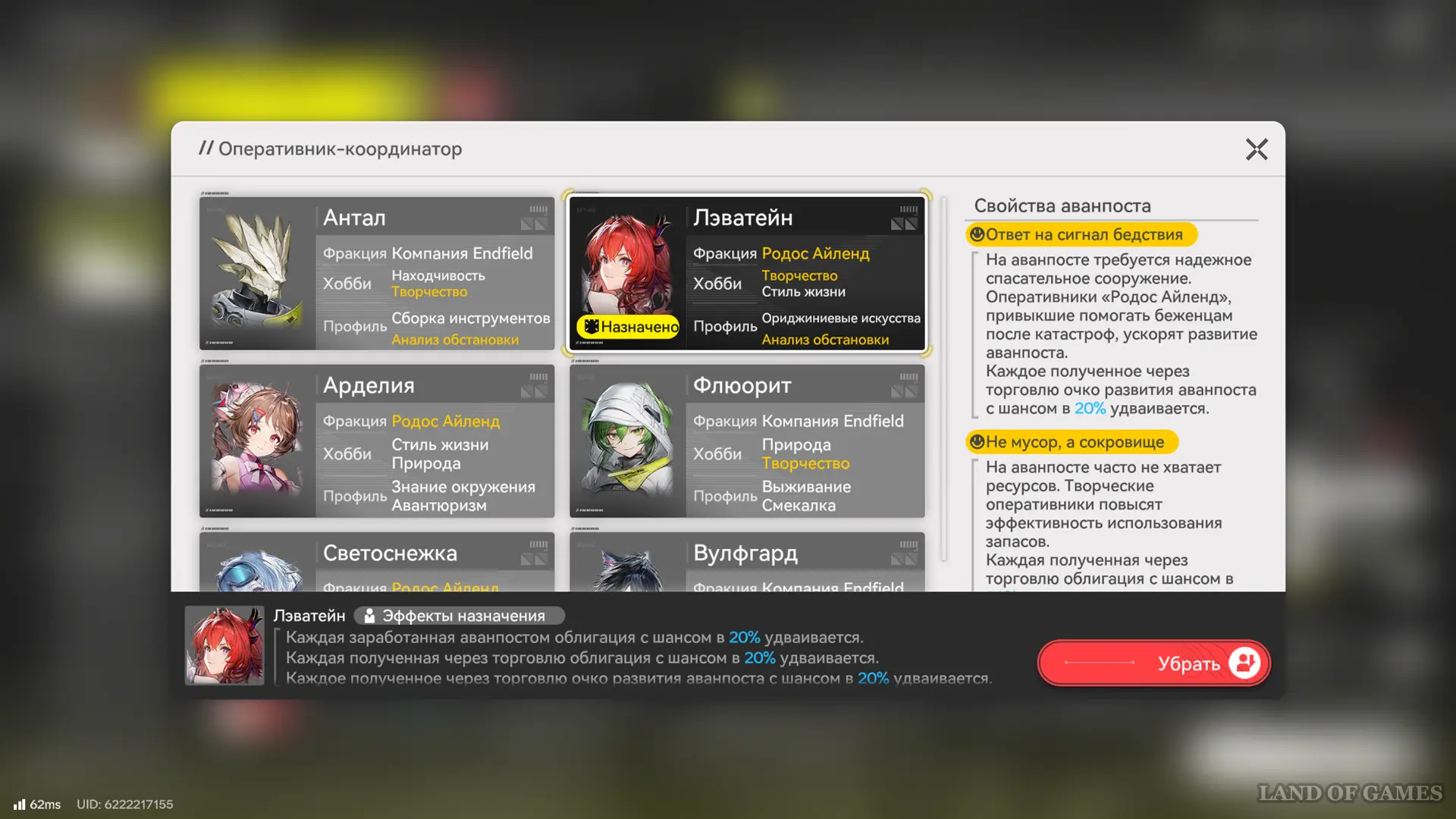 К каждому управляемому аванпосту можно привязать оперативника, выполняющего роль оператора-координатора. Их эффекты назначения влияют на бонусы аванпоста, поэтому подбирайте подходящего героя, чтобы максимально эффективно накапливать запасы.
