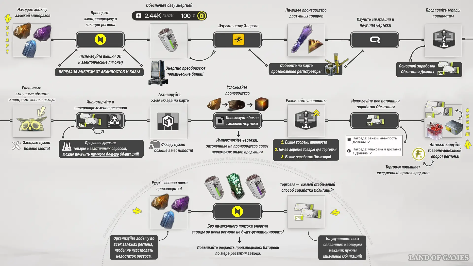 Чтобы обеспечить бесперебойное функционирование АПК, нужно наладить зацикленную цепочку действий, в основе которой лежат вышеупомянутые процессы. При их недостатке производство быстро встанет. Для комфортного освоения системы заводостроения далее в гайде мы последовательно рассмотрим все входящие в нее этапы.
