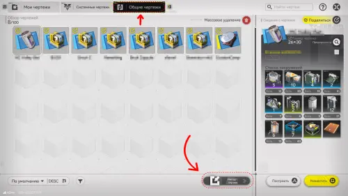 | F1 | Меню чертежей. На клавиши E и Q можно переключаться между личным, системным и общим разделами. |