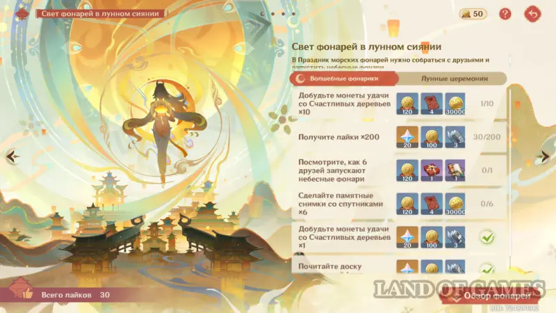 - За 6 фонарей — 120 монет удачи, памятные сувениры (5 небесных фонарей от персонажей) и Руководство по небесным фонарям (позволяет запустить множество фонарей сразу).
