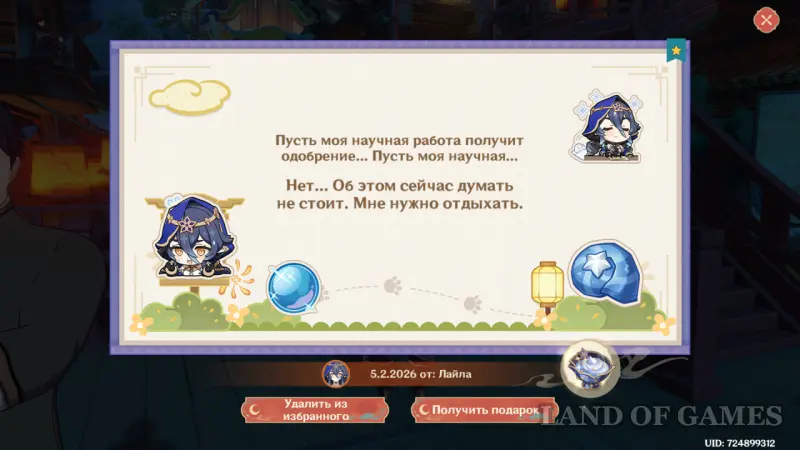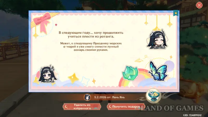 В этой части события вам нужно поговорить с друзьями и вместе запустить фонарь. После вы сможете посмотреть на оформление фонарика и получить памятный подарок — особое блюдо каждого из героев.