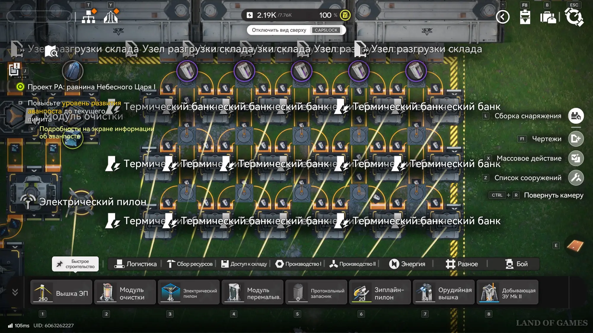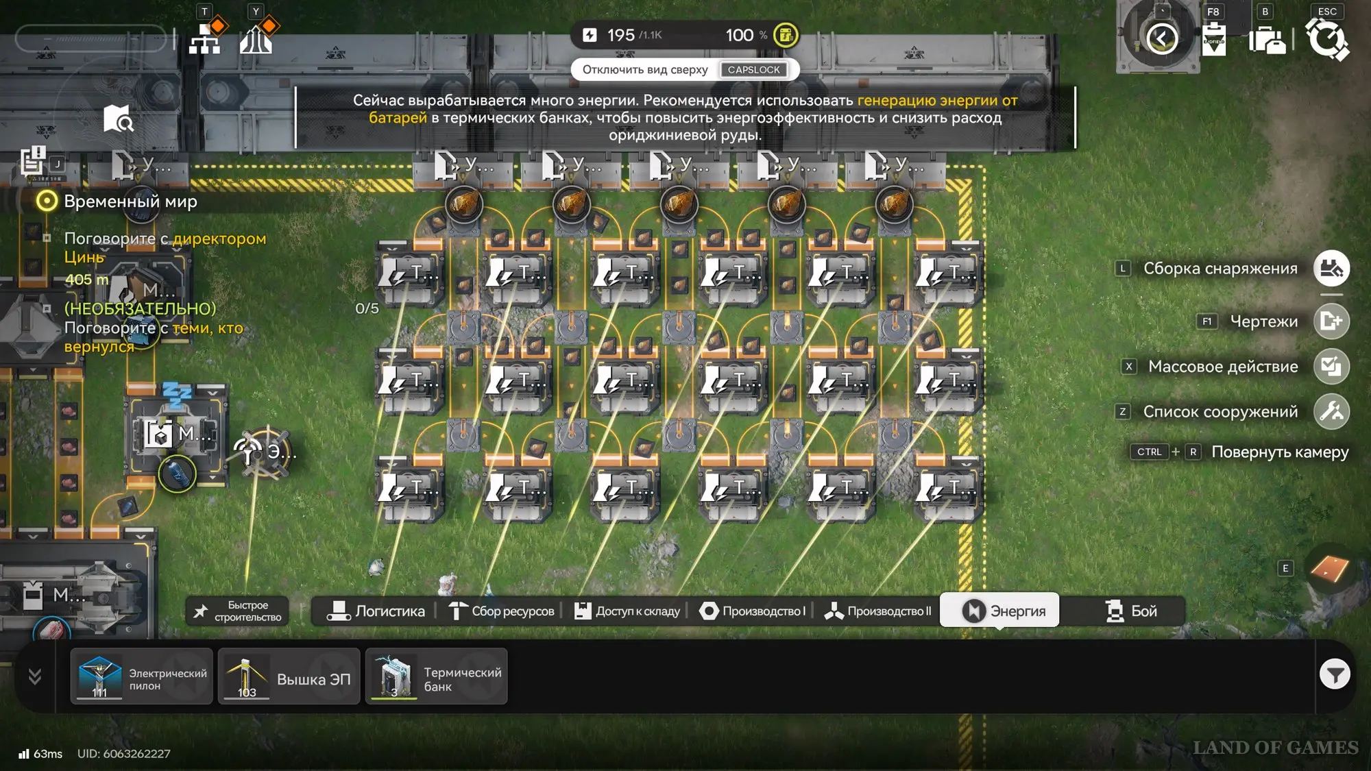 При этом никто не запрещает вам продолжить расширение электростанции, установив даже третий ряд термических баков, повысив выработку энергии до 1-1,05 тысячи единиц. Однако мы не советуем вам продолжать расширяться, так как вы начнете занимать больше полезного пространства на базе. Вместо этого мы рекомендуем заменить ориджиниевую руду на батареи, которые будут приносить намного больше энергии.