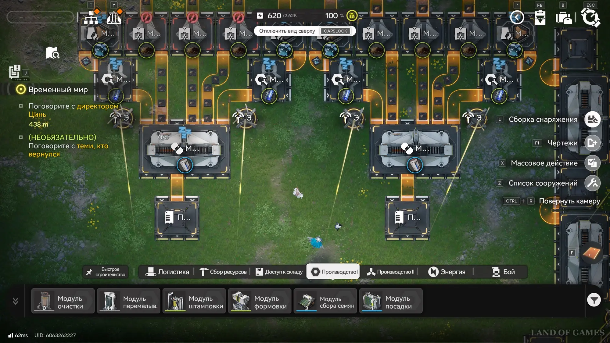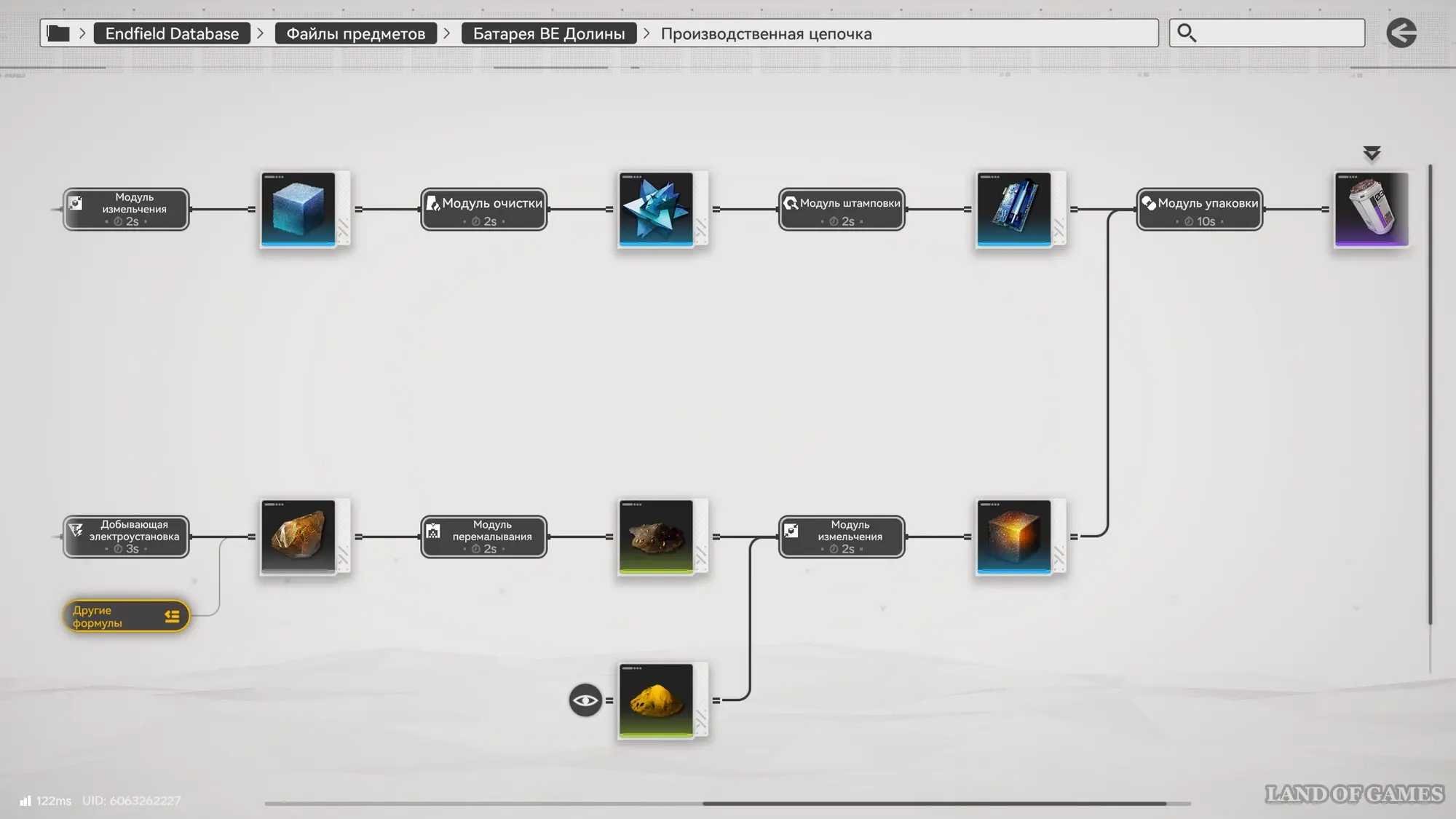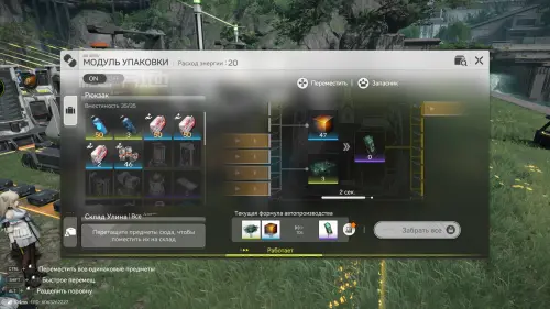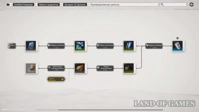 Как можно увидеть, в рамках него создаются аметистовые детали и сразу два ряда молотого ориджиния, которые затем поступают в модуль упаковки, где производятся батареи. Последние впоследствии отправляются в Протокольный запасник (требуется технология «Полевой запасник»), благодаря которому вся продукция тут же поступает на склад.
