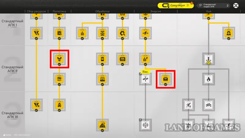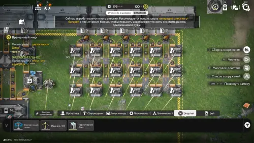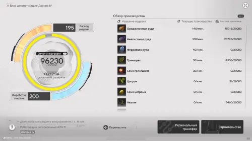 Находясь в ключевой зоне АПК, вы постоянно будете видеть в верхней части экрана шкалу, указывающую на текущее количество выработки энергии и ее траты. Вначале она всегда составляет 200 единиц. В случае превышения этого показателя (например, если вы установите больше производящих линий) цифра покраснеет, а значение в процентах (показывает объемы резервов) с правой стороны начнет уменьшаться, и когда оно достигнет нуля все ваше производство встанет.