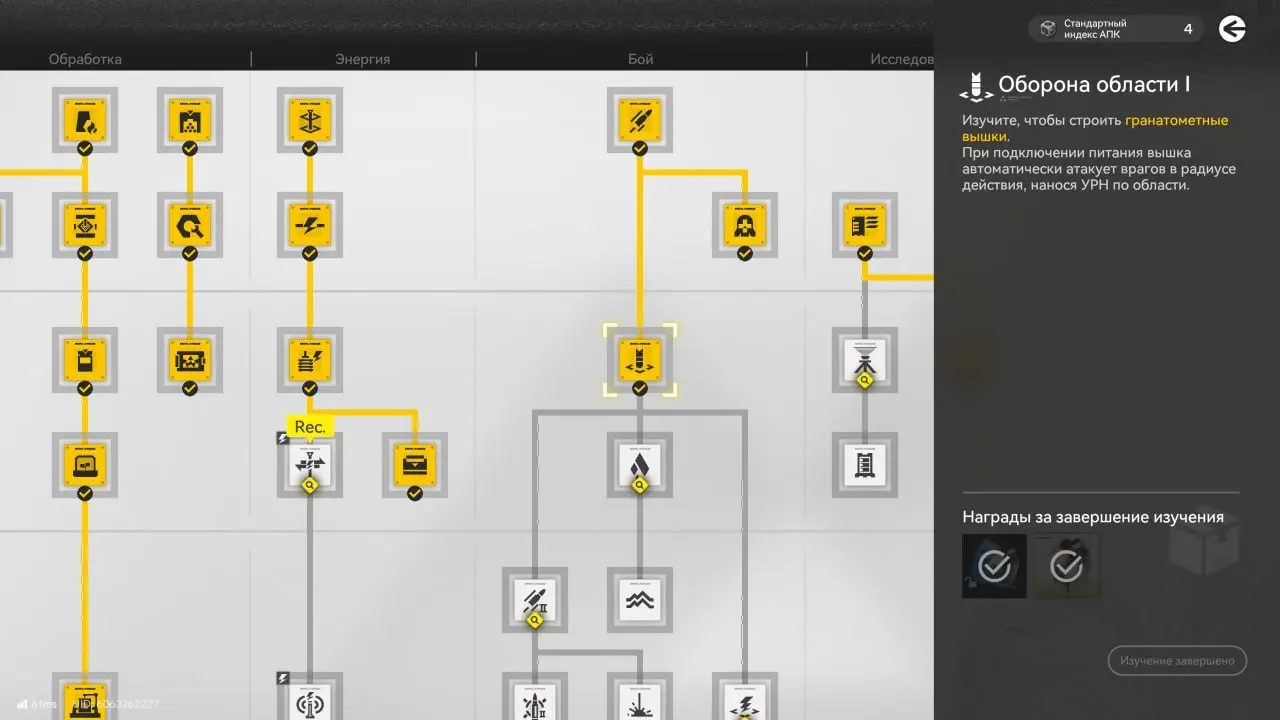 Важно учитывать, что для создания гранатометных вышек (вы можете обойтись и без них, однако с ними пройти этап будет гораздо проще) предварительно требуется открыть технологию «Оборона области I» в плане АПК. Без нее нужные сооружения будут недоступны для строительства.